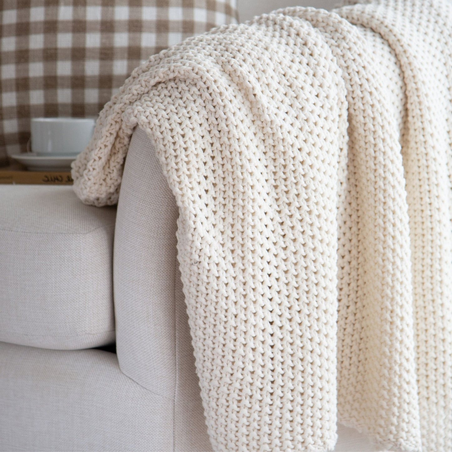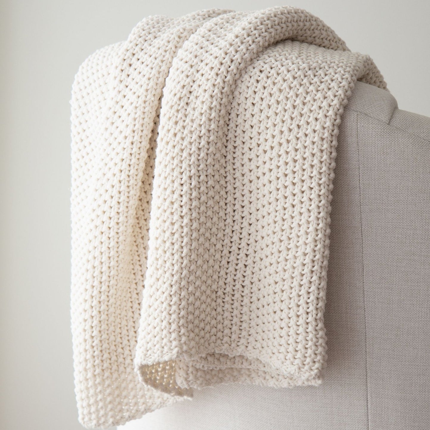 Chloe cotton chunky knit throw - a timeless and classic form of knitting that alternates purl stitch and knits stitch to create a super drape soft flowing knit. This is a medium-weight all-season knit, beautiful to look at with a fabulous drape.