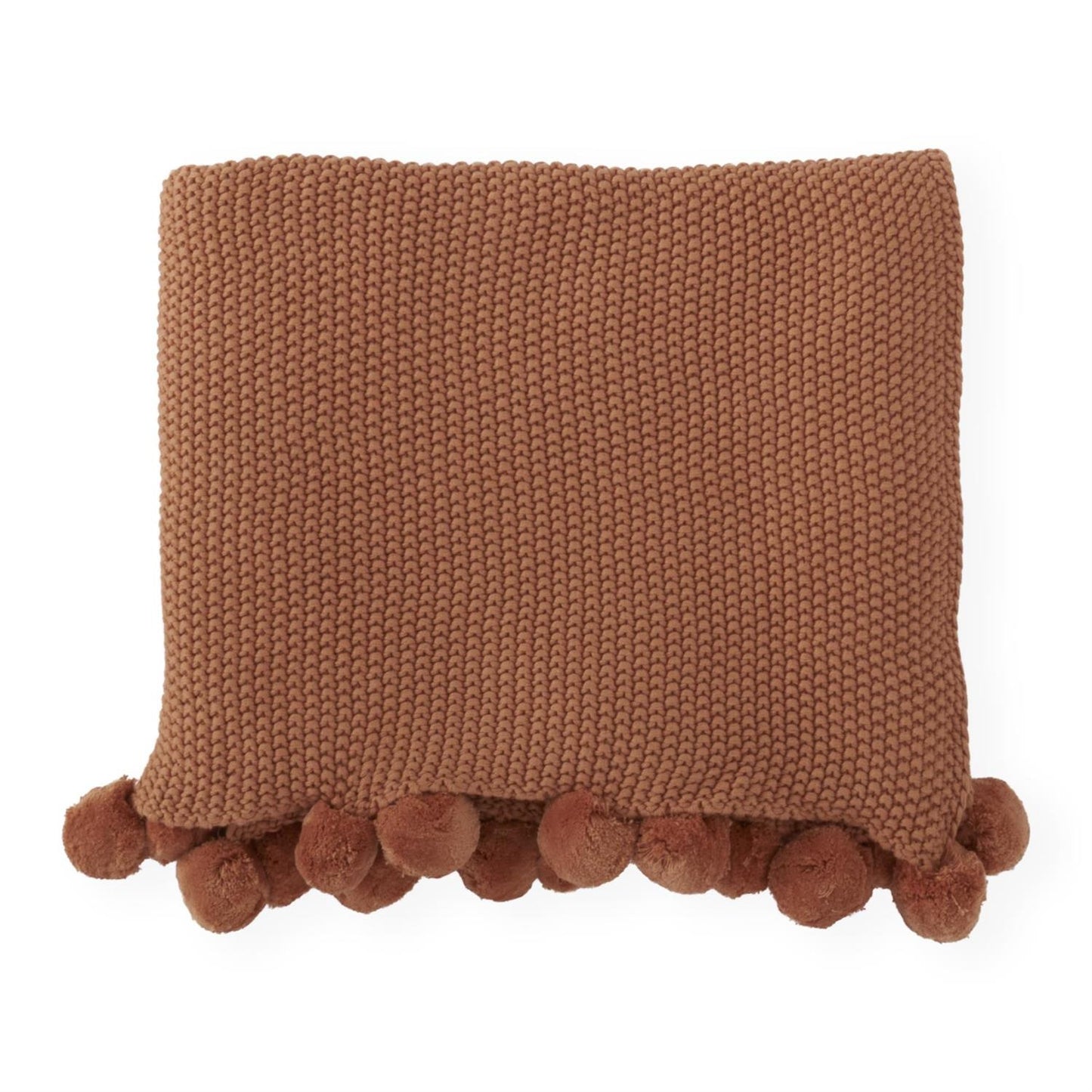 Rust Moss Stitch Knit Throw Blanket With Pompom Trim