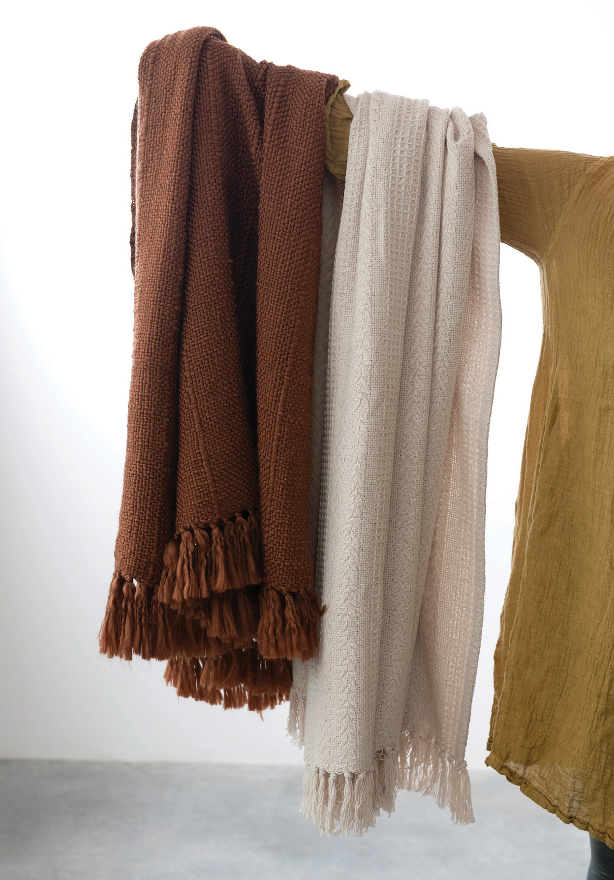 Woven Recycled Cotton Throw w/ Fringe, Cream Color