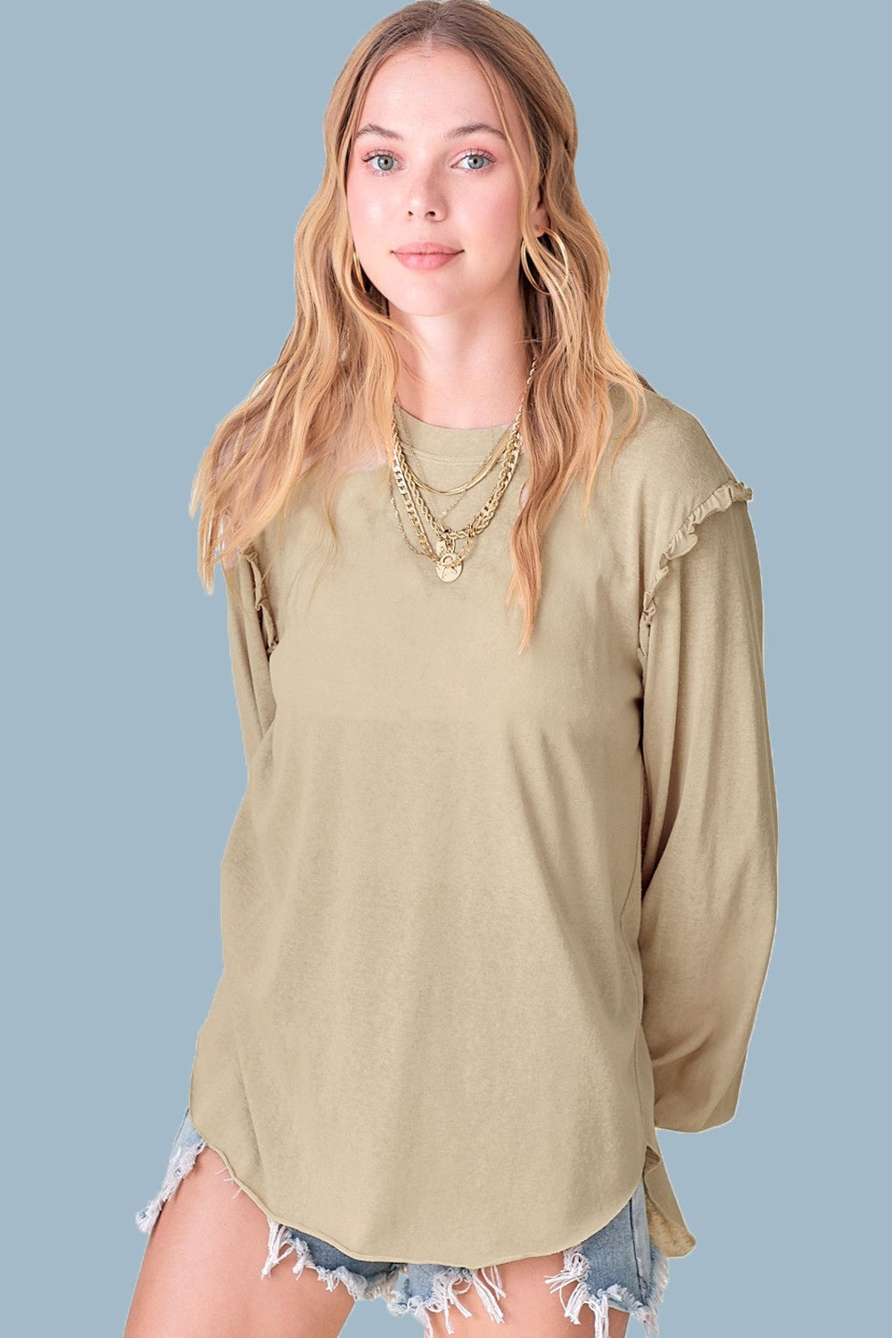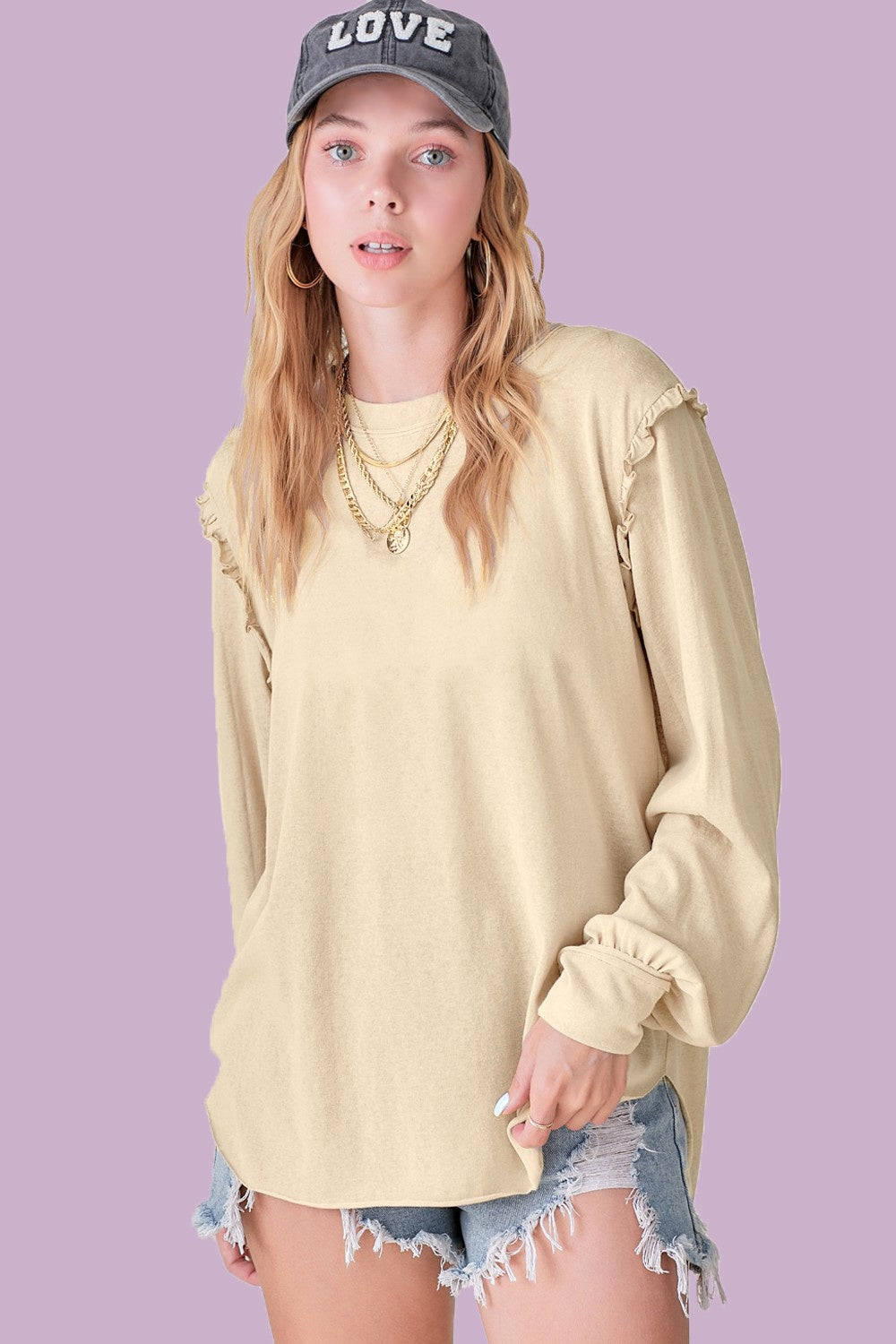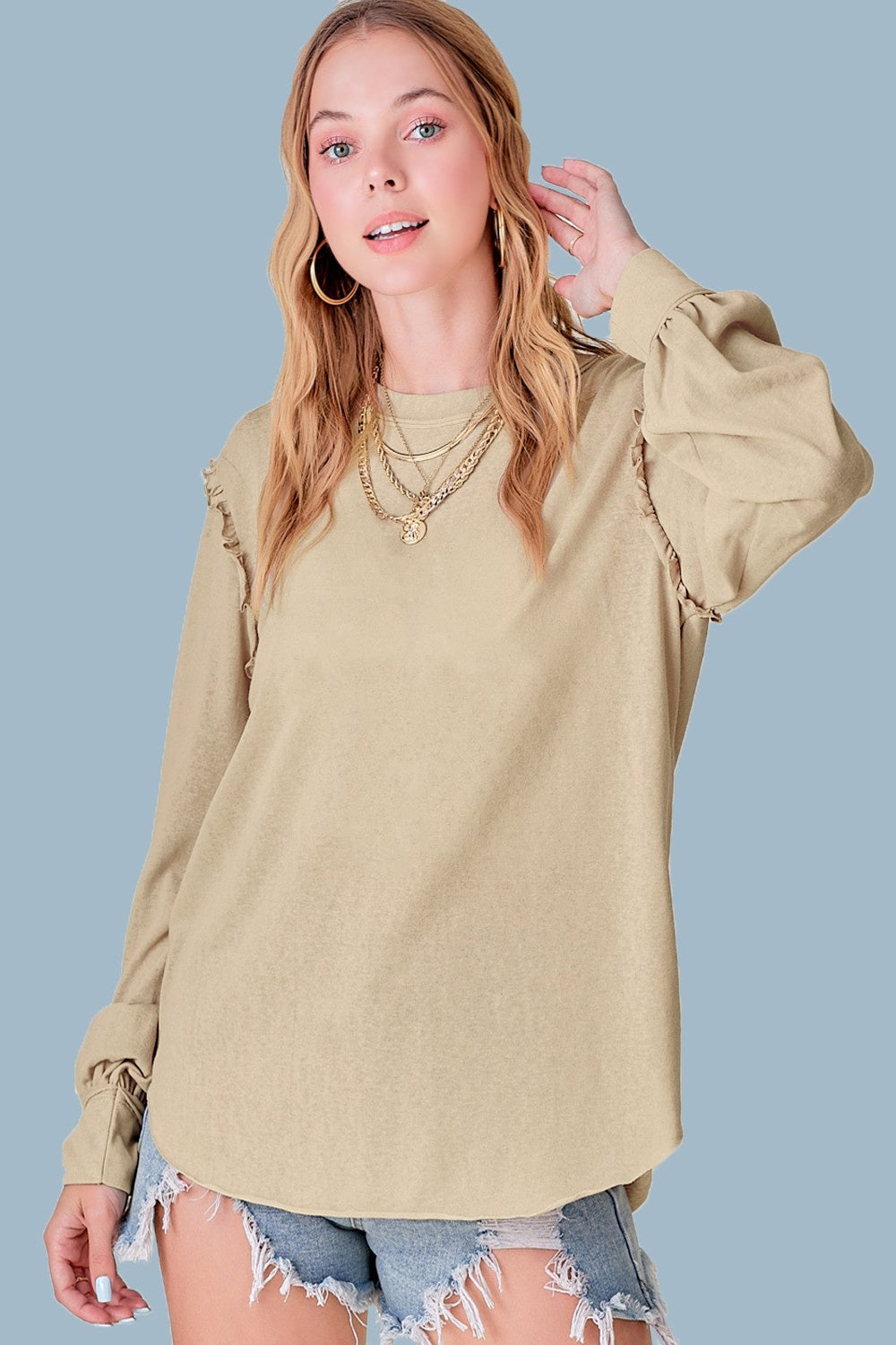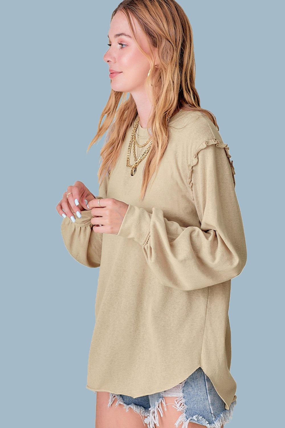 Balloon sleeves with cute ruffles on the shoulder and shirring details on the back with round shoulder with raw hem details.