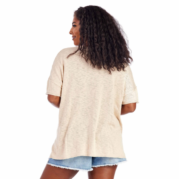 The Evan Tan Top is a women's top crafted from a cotton blend slub fabric, offering both style and comfort. Its oversized fit and dolman short sleeves create a relaxed and trendy appearance.