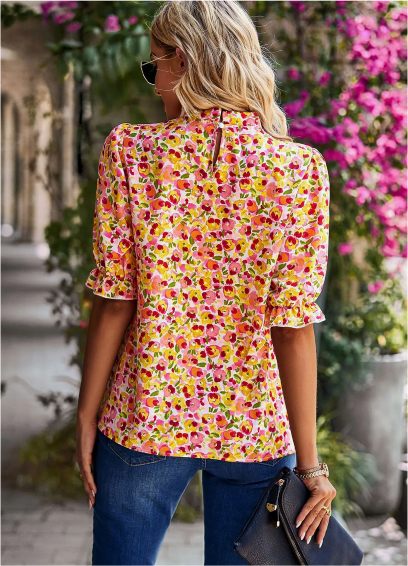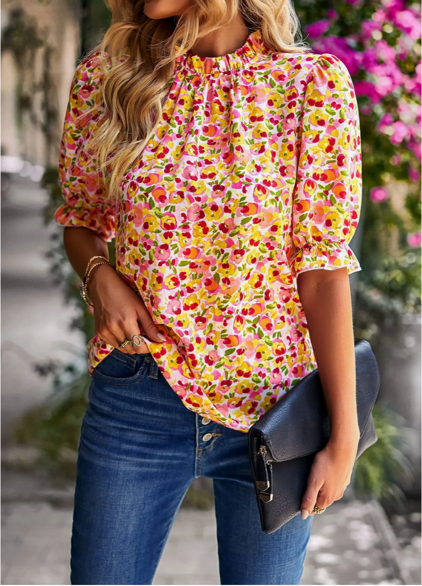 The blouse has a mock neck collar, which adds a sophisticated touch to the design, and half-length sleeves that provide some coverage while keeping you cool in warmer weather. The blouse is made from a lightweight and breathable fabric, making it comfortable to wear throughout the day. The loose and flowy fit of the blouse gives a relaxed and effortless vibe, while still providing a flattering silhouette. The blouse can be easily dressed up or down, making it a versatile option for various occasions. Pair it with jeans or shorts for a casual look, or dress it up with a skirt or dress pants for a more formal setting. The Floral Print Mock Neck Half Sleeve Blouse is a must-have addition to any fashion-conscious woman's wardrobe.