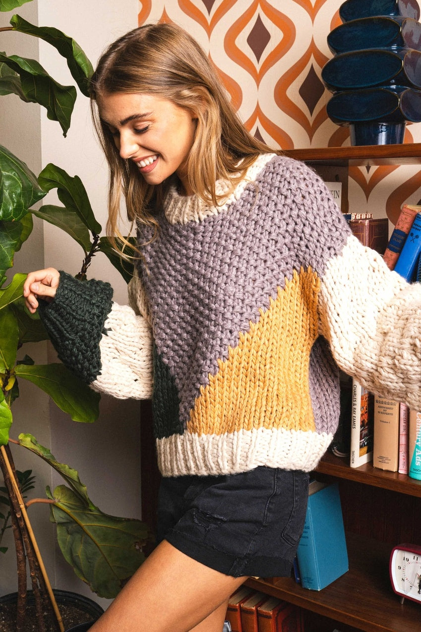 Hand Knitted Color Block Bell Sleeve Sweater Top