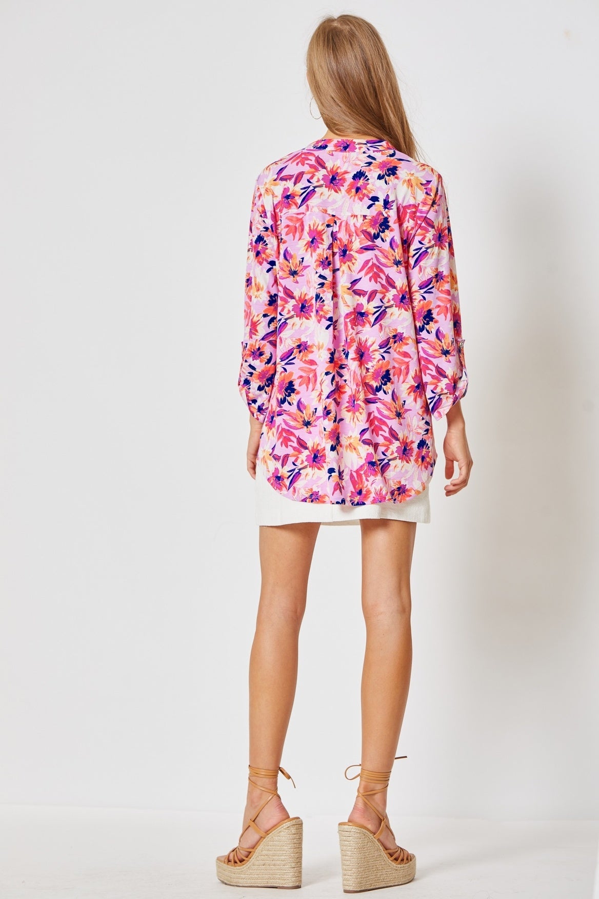 Lizzy top also features China collar neckline with 3/4" length sleeves with tab details. The fit is relaxed, flowy fit with slight high low.
