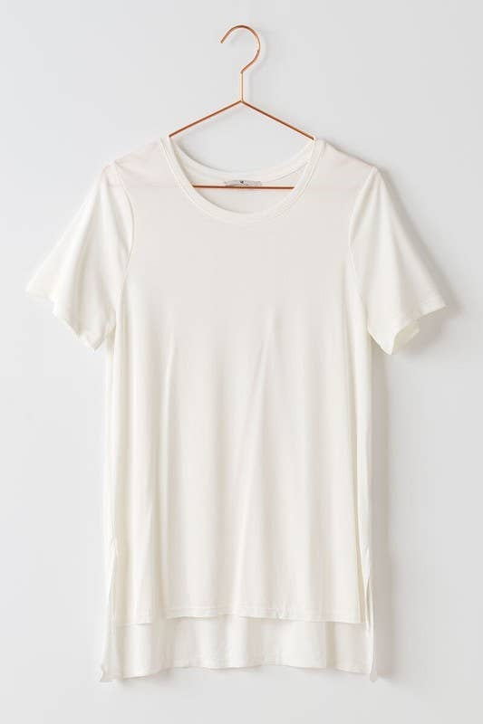 The classic crew neck design is elevated with a stylish slit on the side, giving it a modern and trendy twist. This top is designed to fit most body types comfortably. Dress it up with a skirt and heels for a night out or keep it casual with jeans and sneakers for a daytime look. This top is versatile and can be worn all year round, making it a must-have in any wardrobe. Elevate your basic look with the Modal Basic Crew Neck with Slit Side.