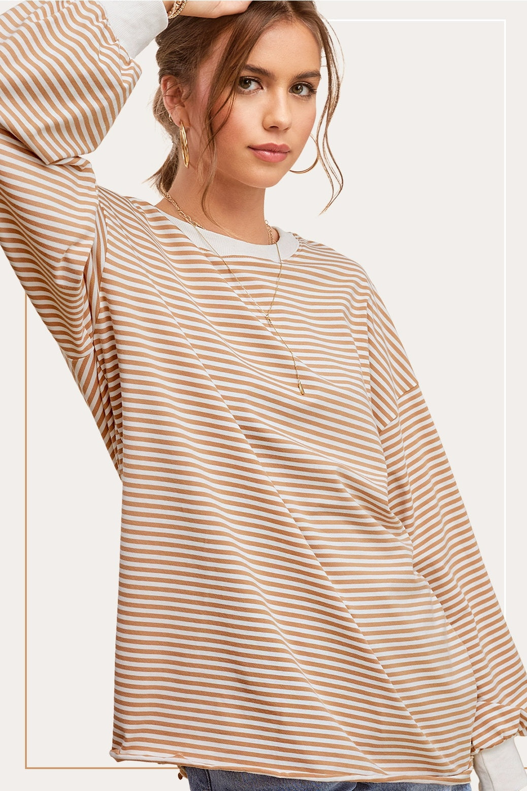 So cool and classic, this timeless crewneck top is featured in an oversized, slouchy silhouette and staple striped print. Lovely for layering or styling solo. Loose fit makes this perfect style for a loungewear too.