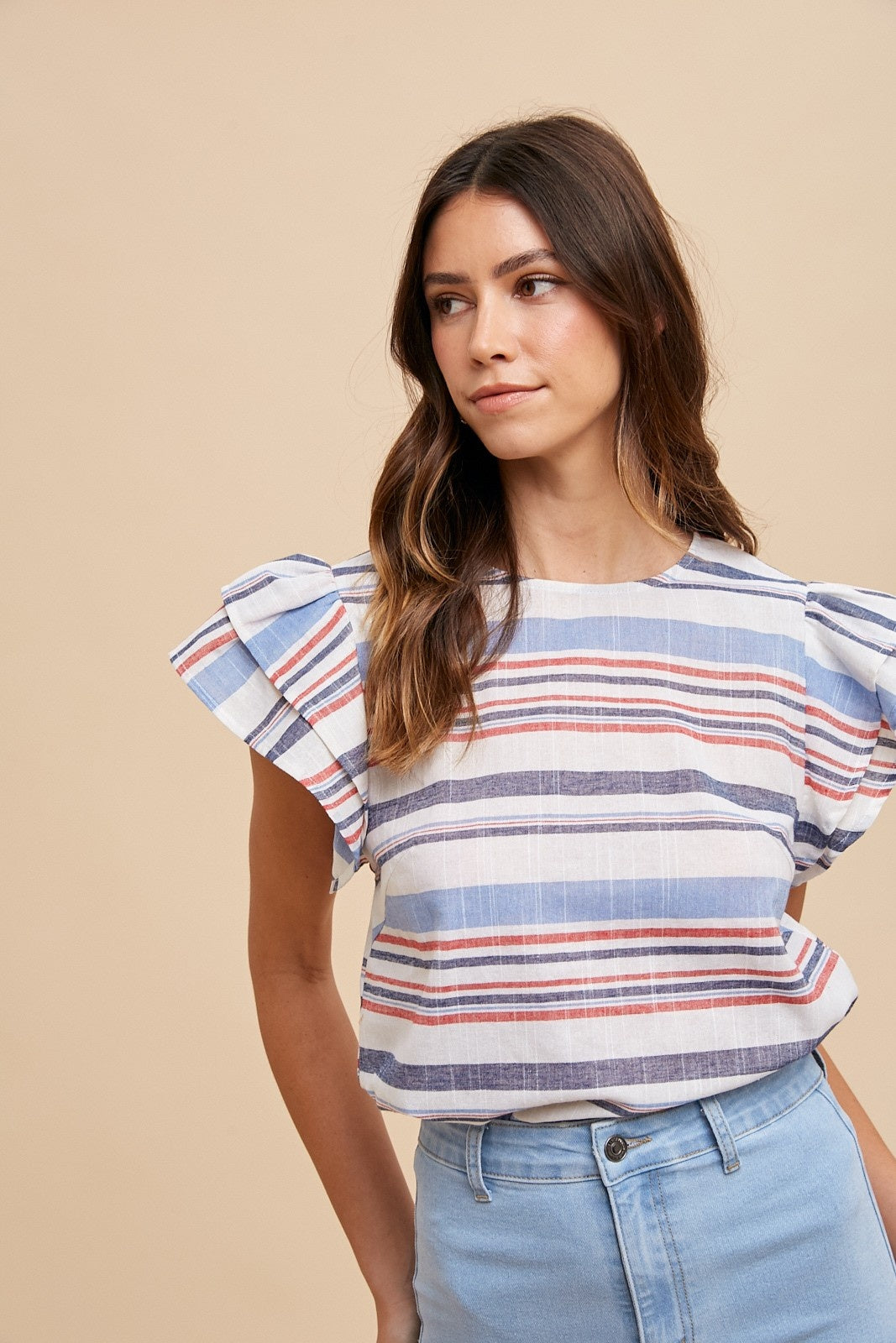 Add a pop of patriotic flair to your closet with our Red, White, and Blue Striped Ruffle Sleeve Top! It's got those classic American vibes with a cute twist. Think comfy fabric, stylish stripes, and adorable ruffle sleeves.