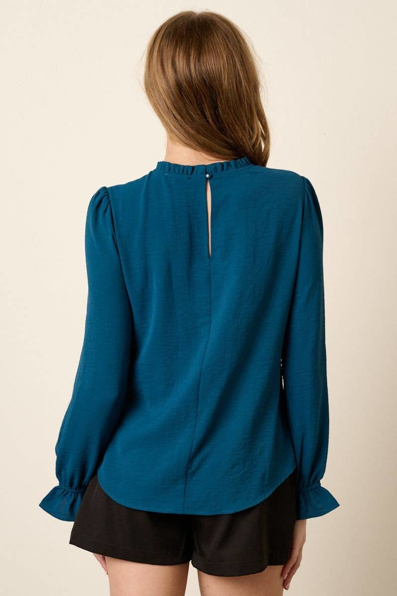 This business causal top is made of airflow woven fabric that features a ruffle mock neck, long sleeves with ruffles, a keyhole back with button, and a stylish curved hemline.