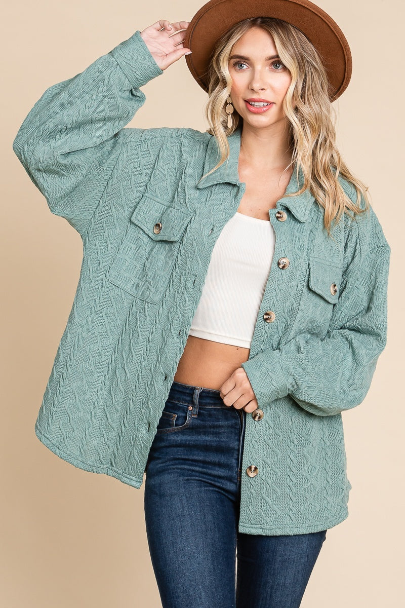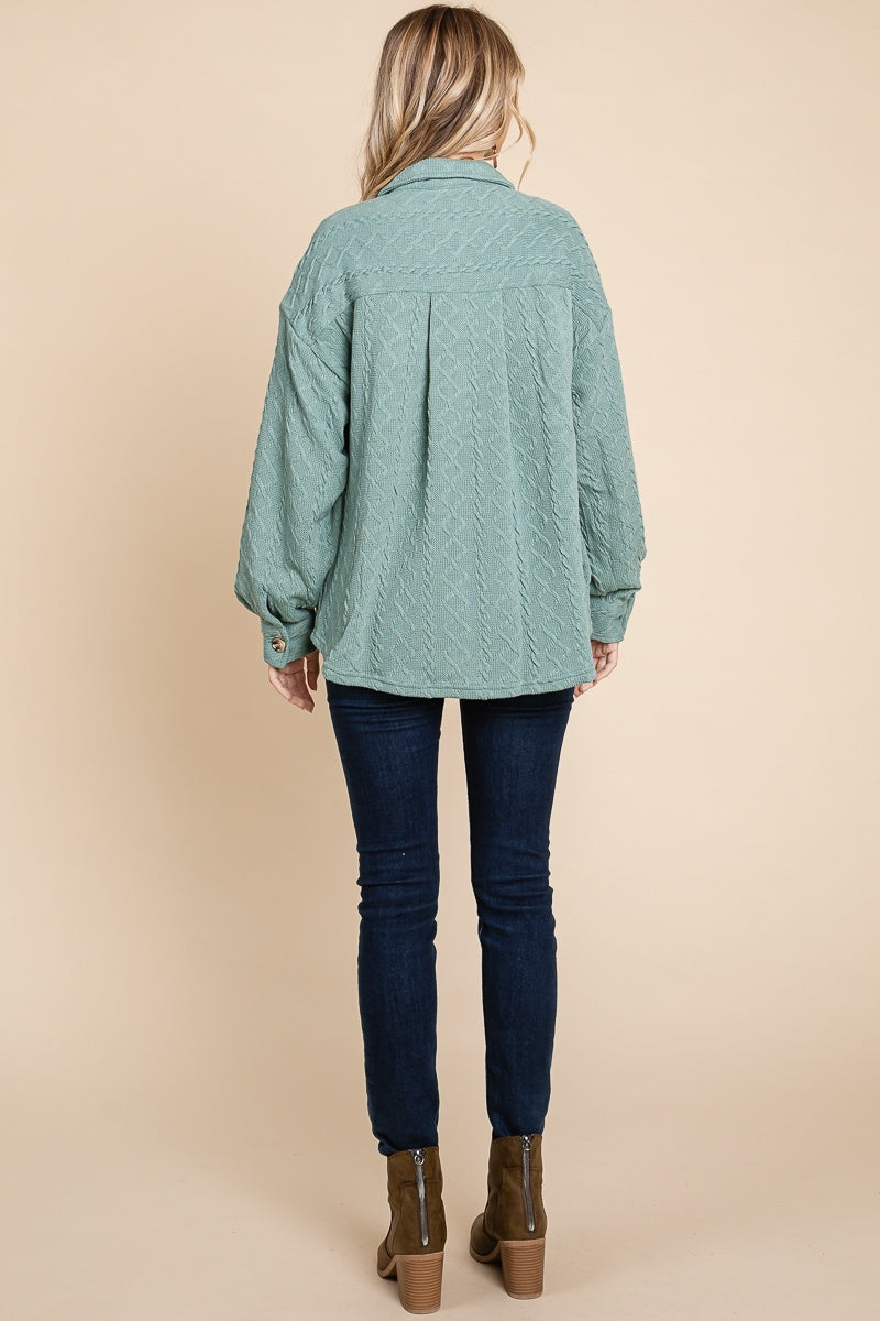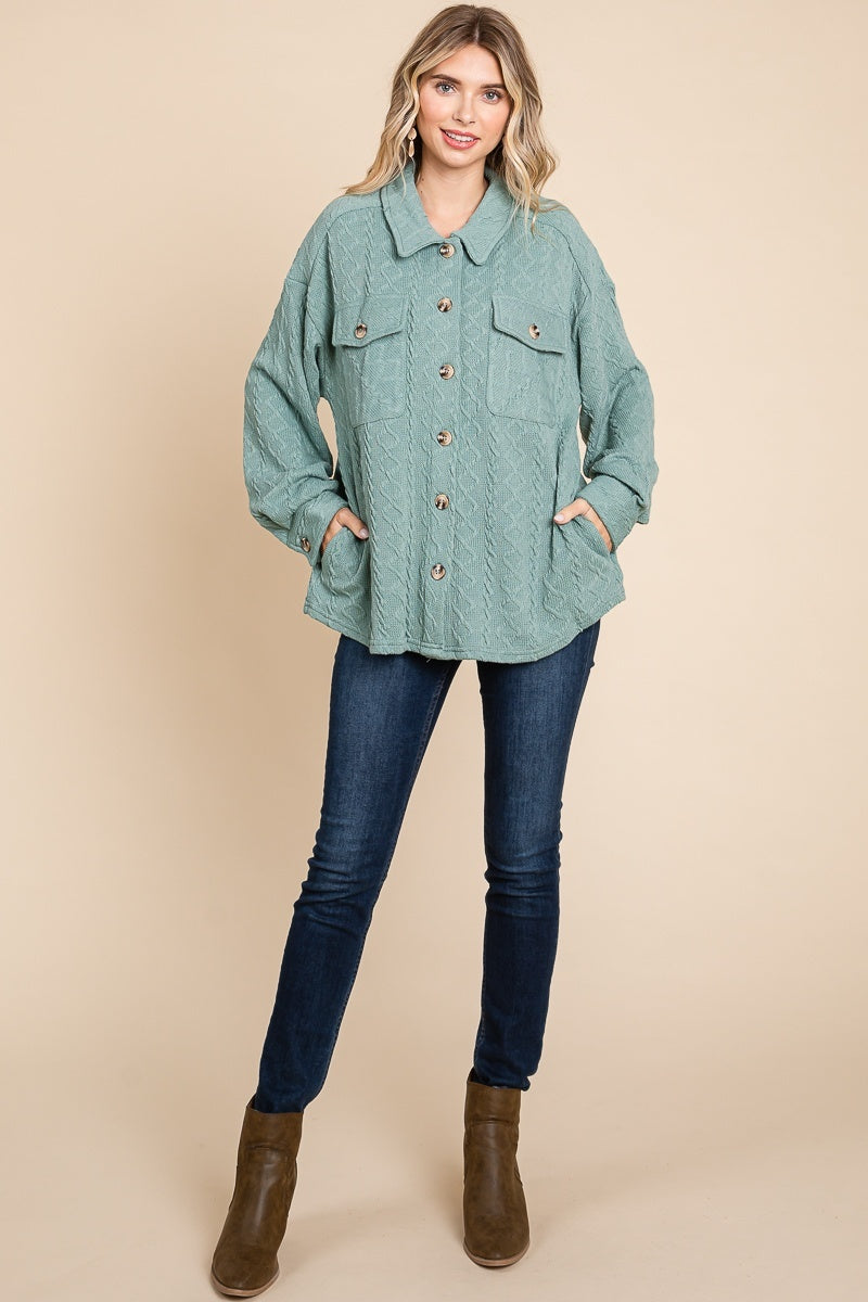 Textured Cable Knit Collared Shacket Sage