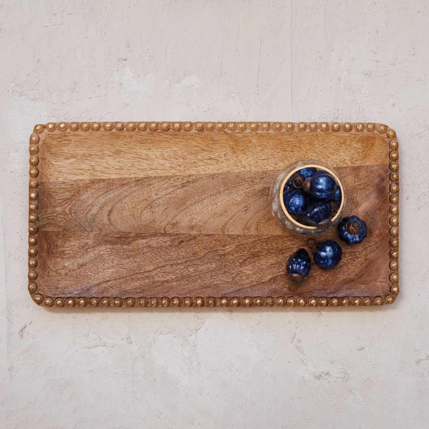 Carved Mango Wood Tray With Wood Beads, Natural & Gold Finish