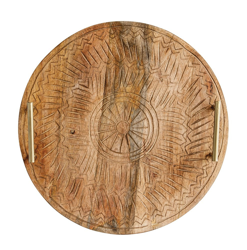 Round Hand-Carved Mango Wood Tray with Metal Handles