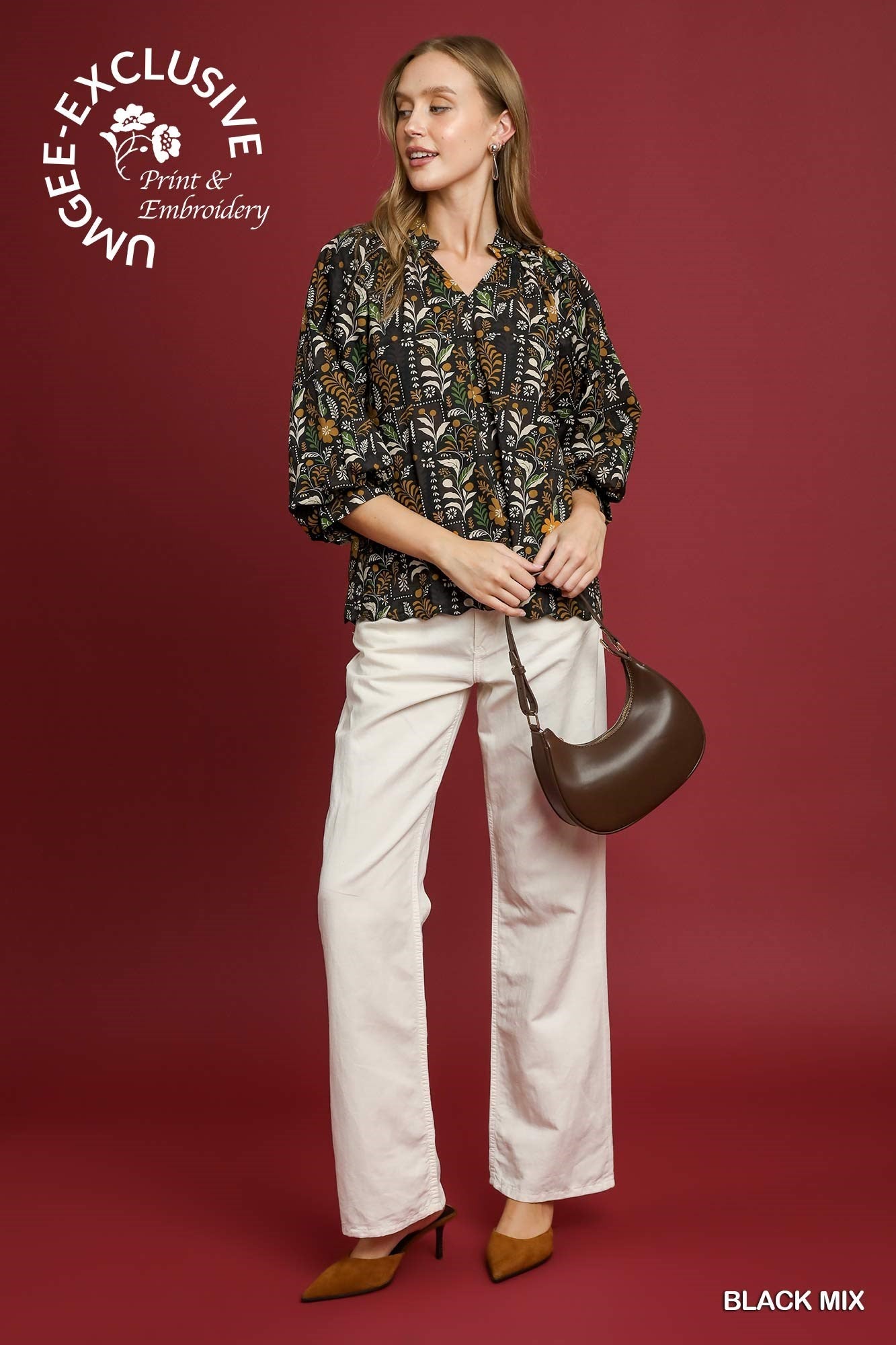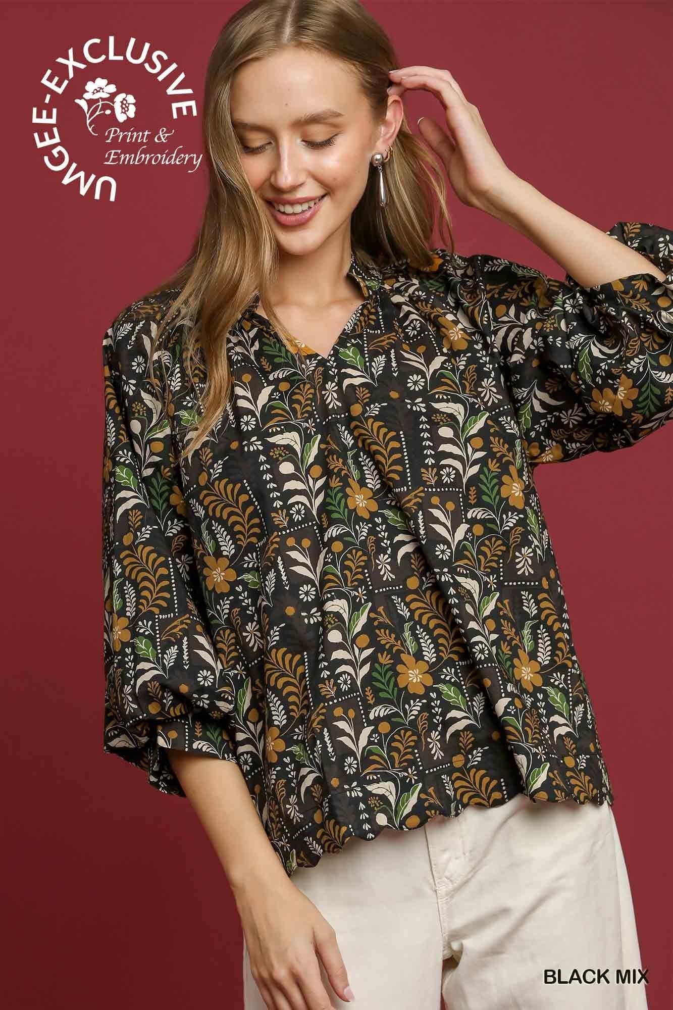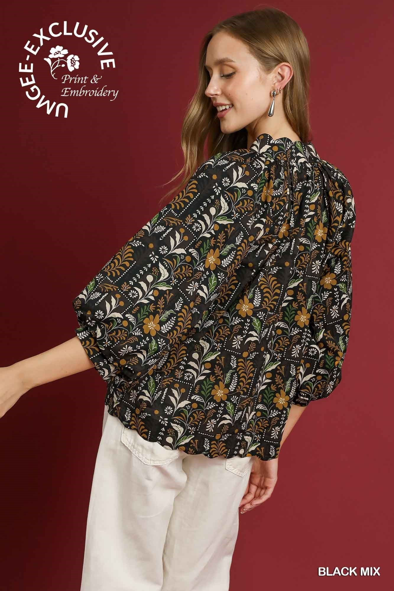 Elevate your wardrobe with this Floral Print Scallop Hem Blouse, designed to blend elegance and comfort effortlessly. Featuring a flattering V-neckline and charming ruffle collar detail, it adds a feminine touch to any outfit. The 3/4 puff sleeves offer a stylish silhouette, while the scalloped hem creates a delicate finish. Lightweight and unlined, this blouse is perfect for layering or wearing on its own, making it a versatile addition to your collection.