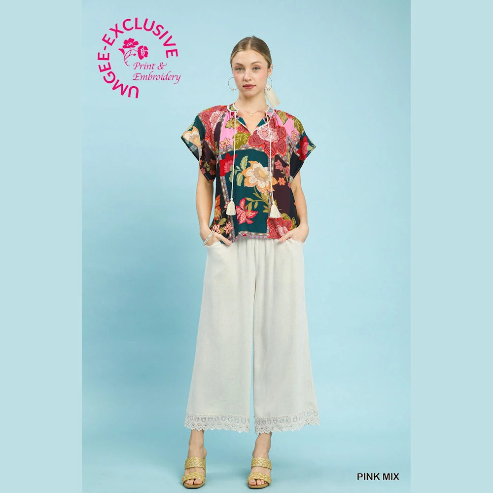 Bring artistic flair to your everyday style with the Mix Floral Patchwork Tassel Tie Top by Umgee. Designed with vibrant patterns and feminine details, this top delivers standout boho charm with easy, all-day comfort.