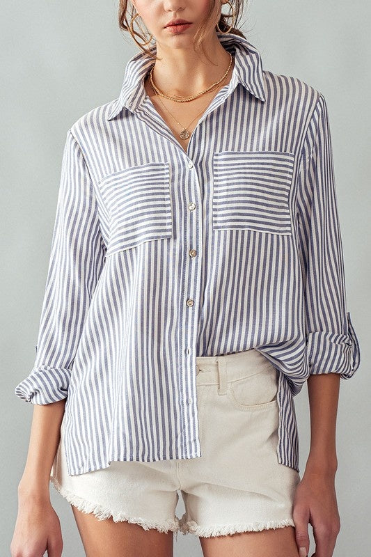 Striped Twill Tape Detail Statement Button Shirt