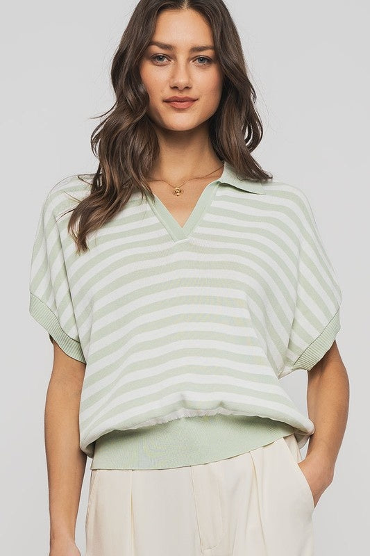 Striped V-Neck Polo Knit Top with Ribbed Trim Detail