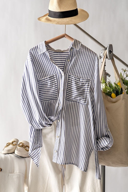 A versatile button-down shirt featuring vertical stripes, relaxed silhouette, and lightweight rayon construction with front pockets that combines classic design with premium fabric, making it perfect for both casual and dressed-up occasions while maintaining its polished look throughout wear.