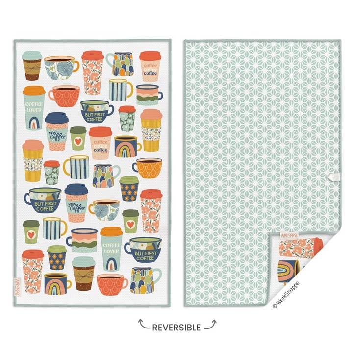 A colorful array of coffee cups in different shapes and patterns adorns this microfiber hard-working towel. It reverses to a graphic coffee bean starburst design on the other side.