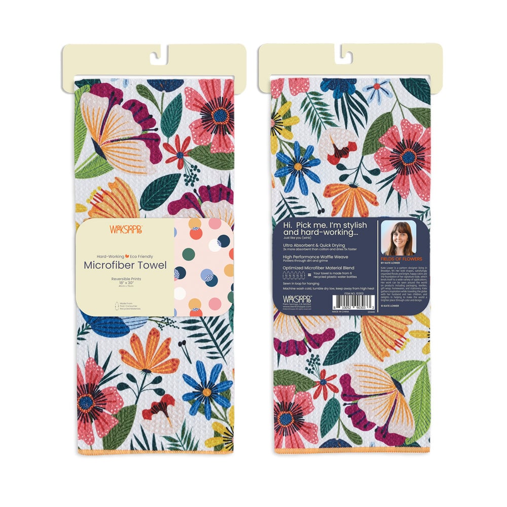 Gorgeous flowers on one side, and bright polka dots on the other, our Fields of Flowers Microfiber Kitchen Towel brightens up any space. An optimized, waffle weave material blend makes these towels ultra-absorbent and quick drying.
