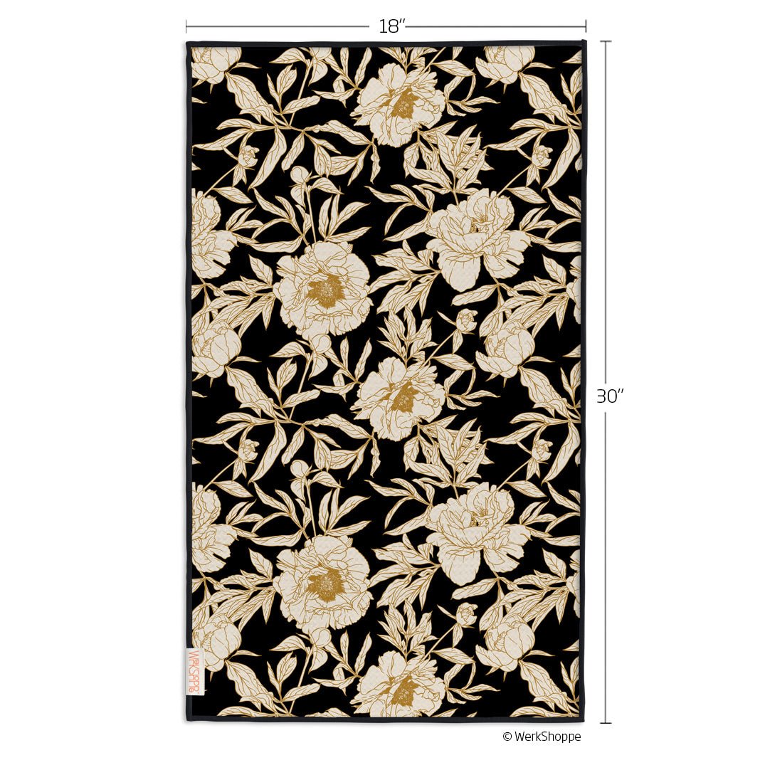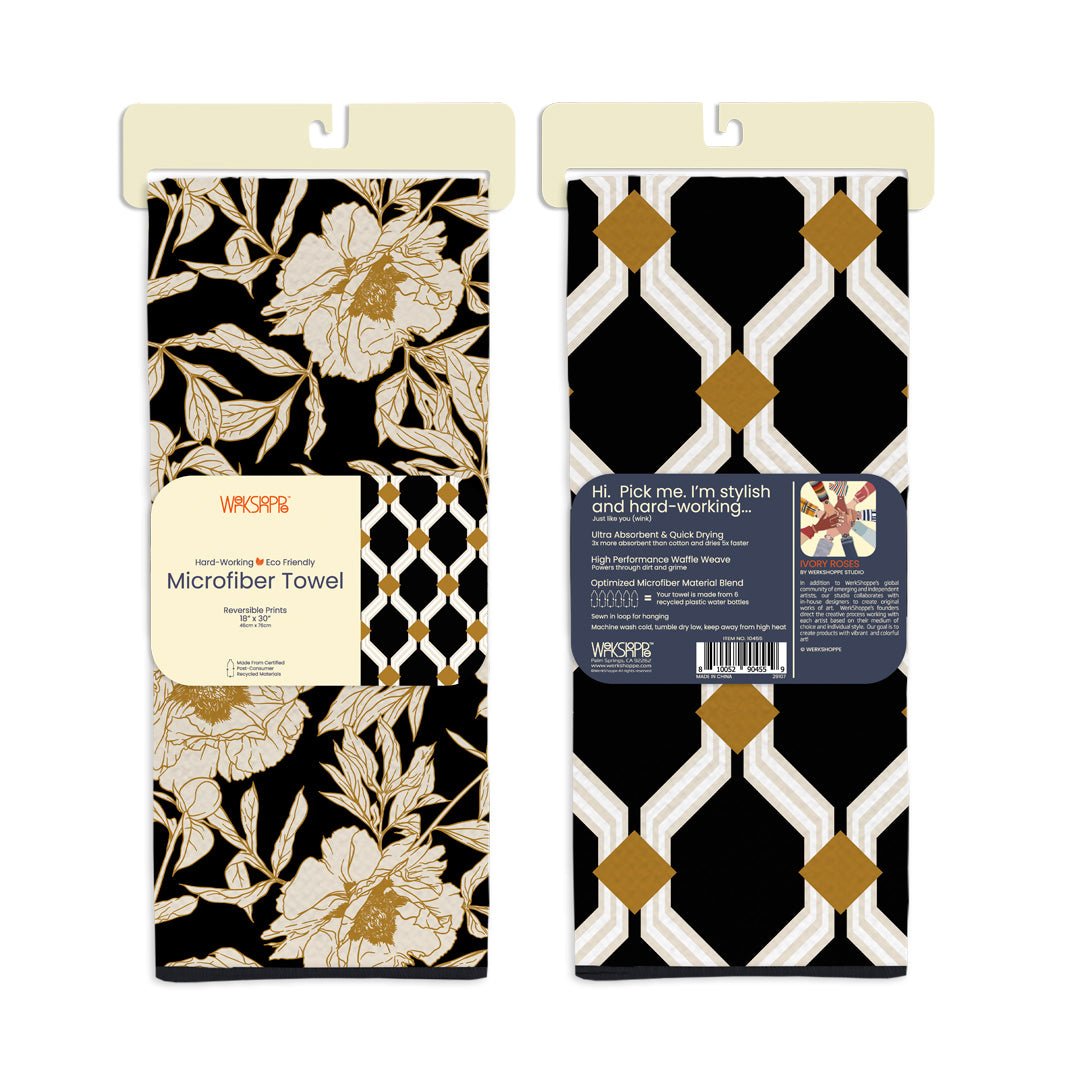This reversible microfiber kitchen towel features ivory-colored roses set against a black background on one side, and a modern lattice design on the other. An optimized, waffle weave material blend makes these towels ultra-absorbent and quick drying.