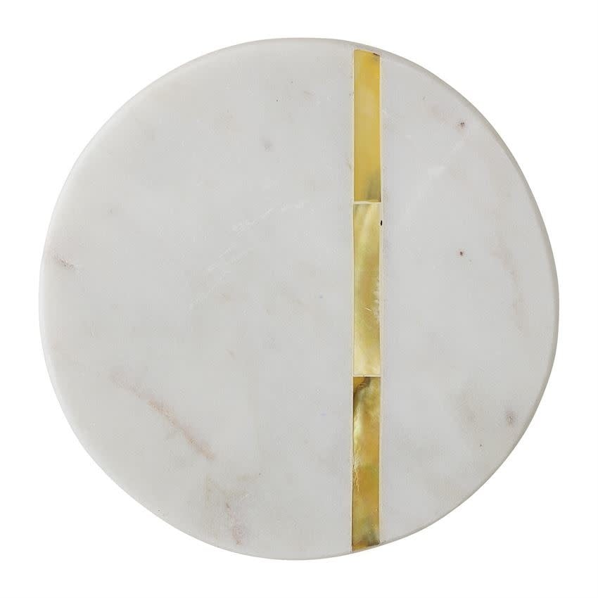 4" Round Marble Coasters, White w/ Gold Finish Metal Inlay, Set of 4