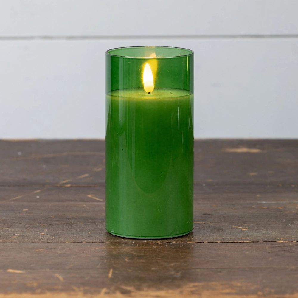 The 6" Pine Green Glass 3D Flame Candle from Ragon House is a unique decor piece. This flameless candle combines the elegance of glass, the durability of plastic, and the authenticity of wax to create a captivating 3D flame effect. It offers the charm of a real candle without the worry of an open flame.