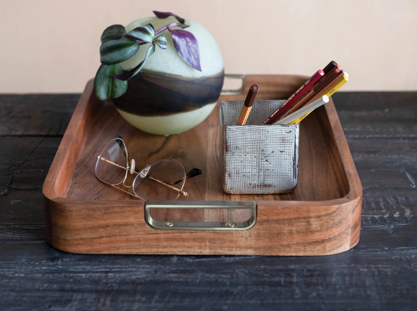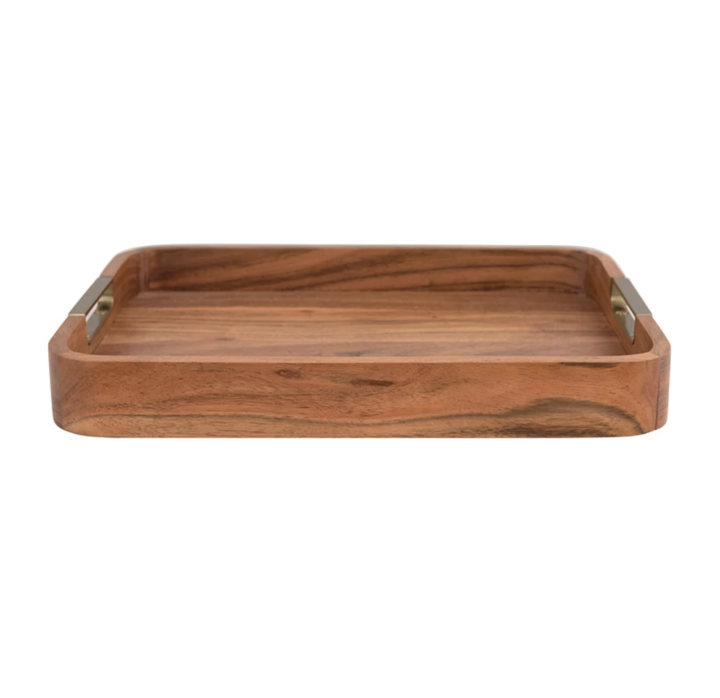 16"L x 12"W x 2"H Acacia Wood Tray w/ Gold Finish Handles
