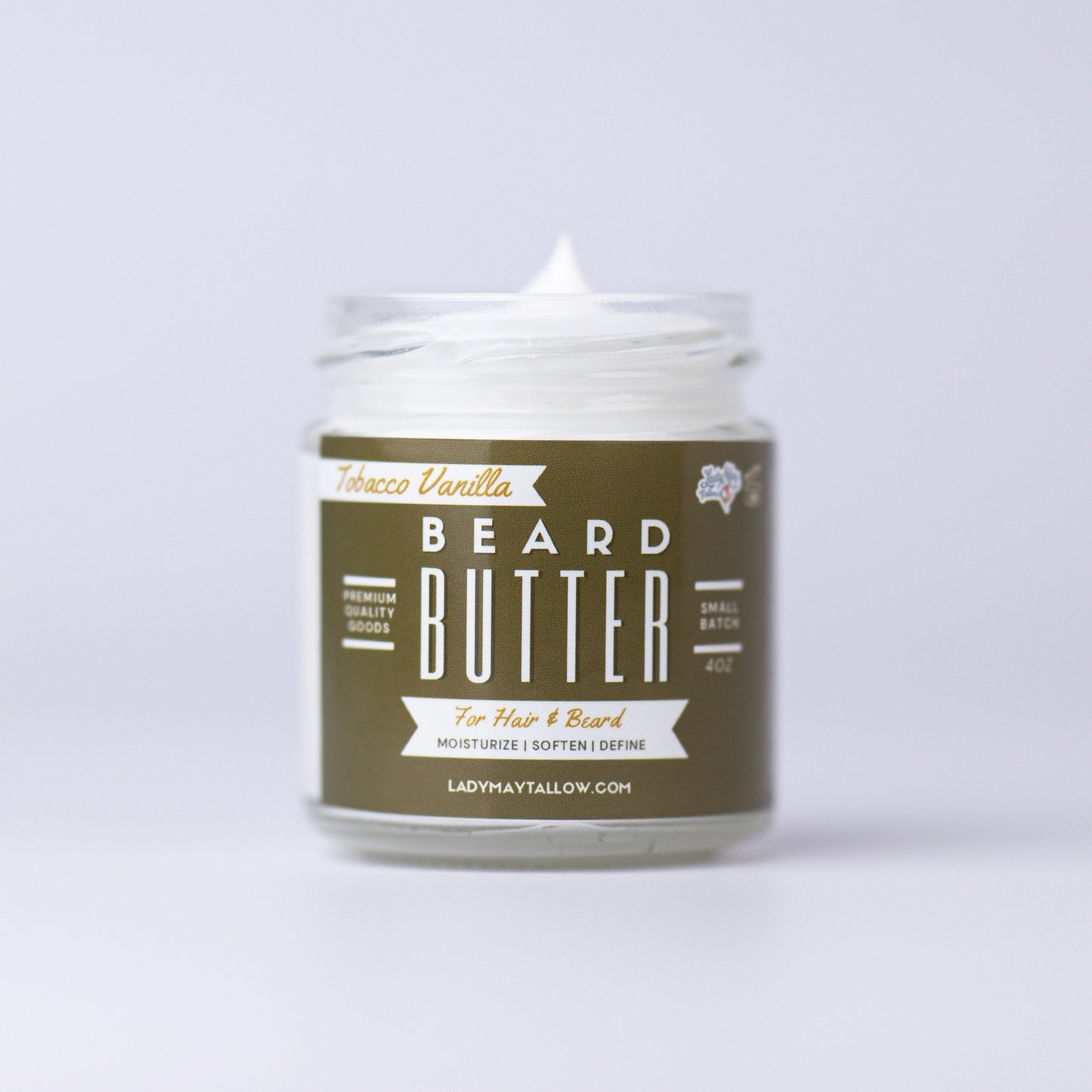 Lady May's All-Natural Beard Butter, a 4oz jar of versatile goodness made to handle all your grooming needs. Not only does it tame and soften your beard, but it also doubles as a rich, hydrating butter for your hair and body.