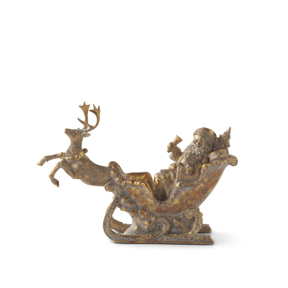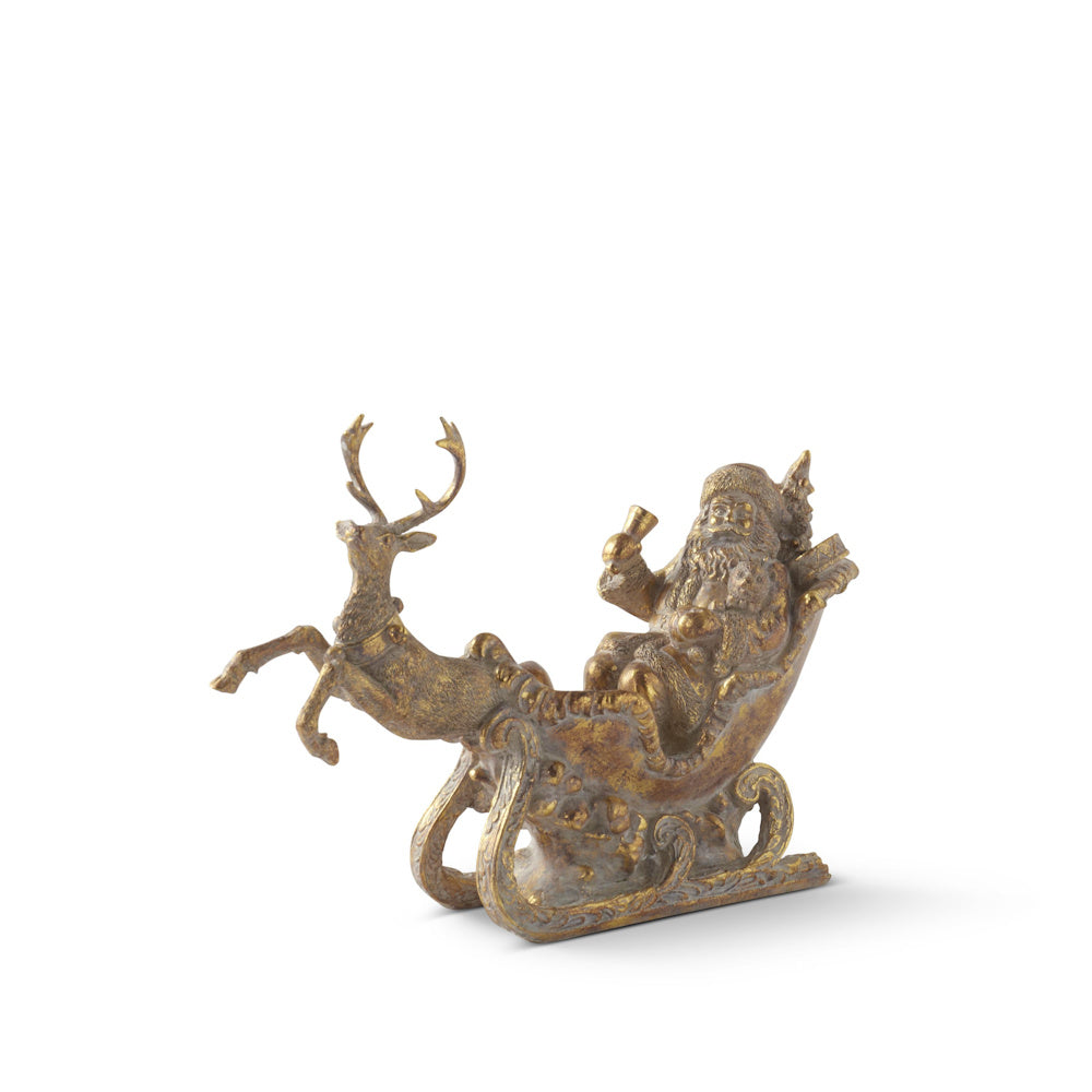 This detailed figurine features Santa riding a sleigh led by prancing deer, all finished in antique gold resin for a timeless, festive look. Perfect for mantels, tables, or holiday displays, it adds classic charm and sophistication to any Christmas setting.