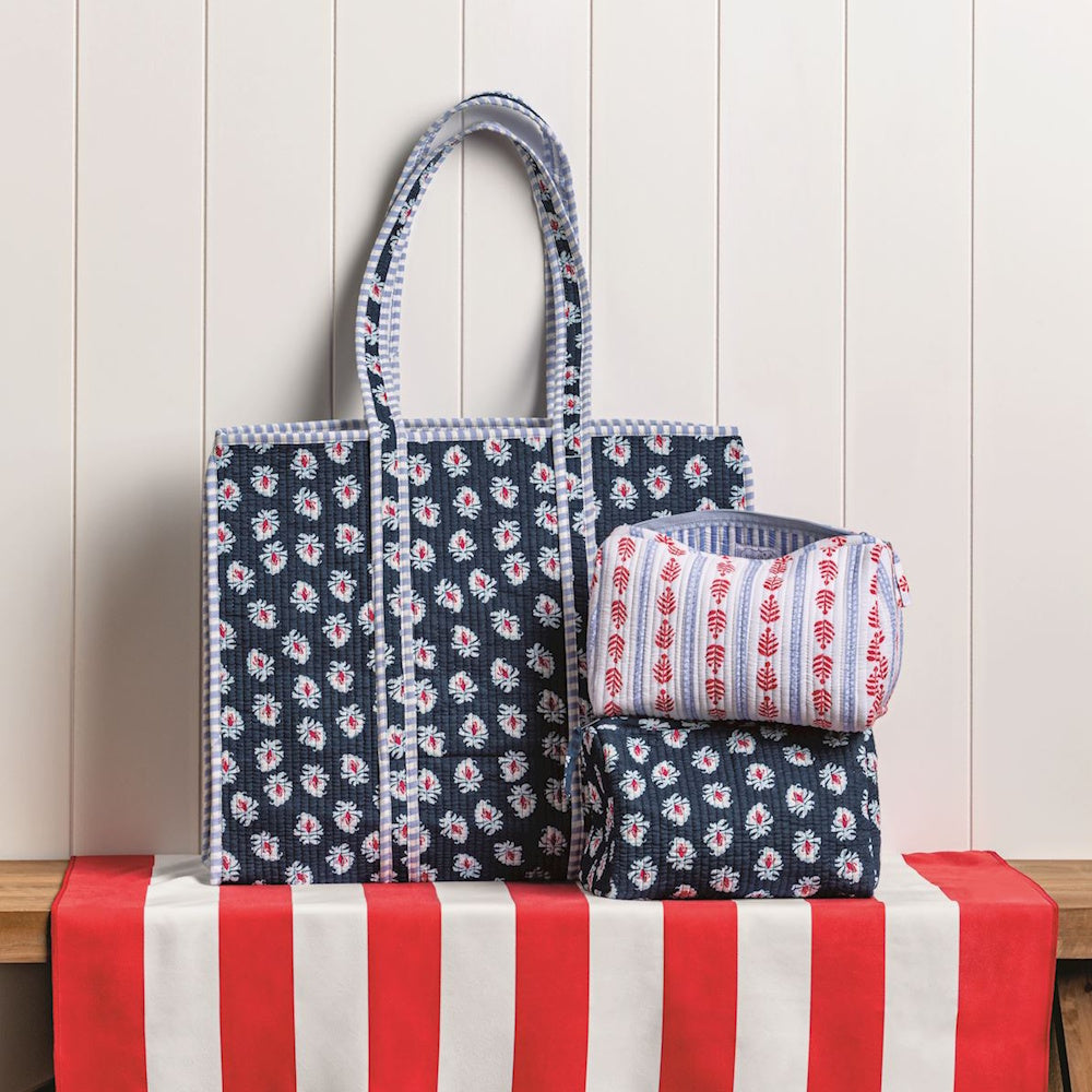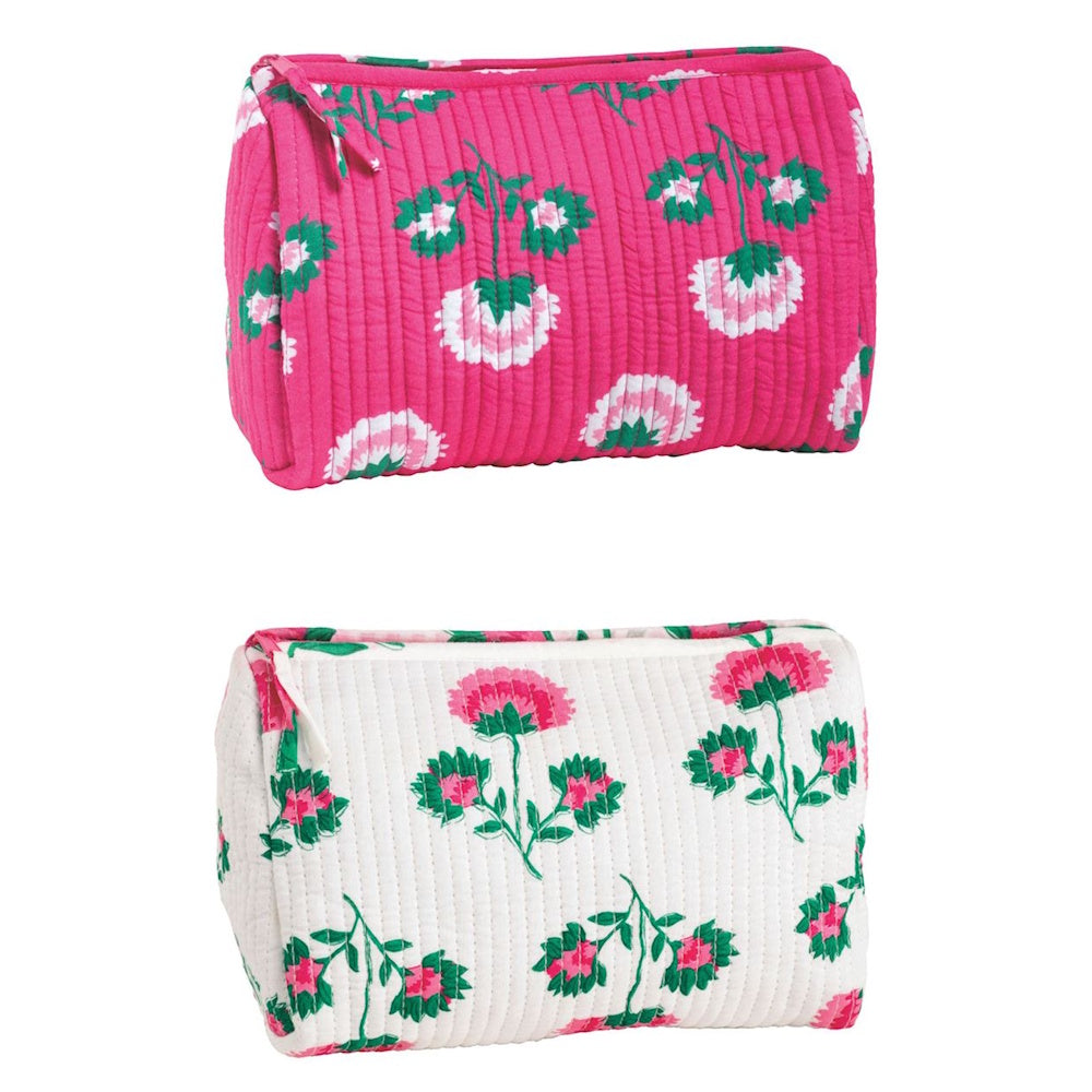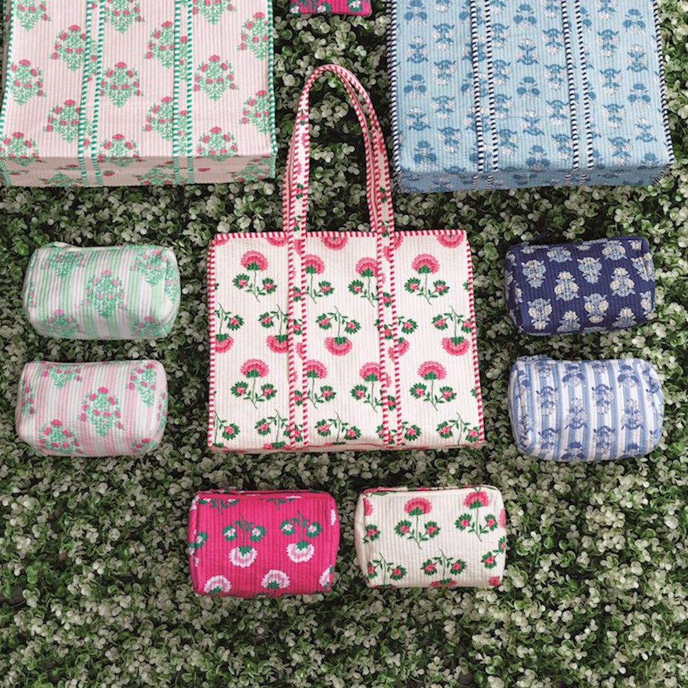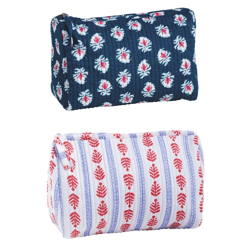 Quilted cotton block print carry-all case with contrast stripe lining and zipper closure.