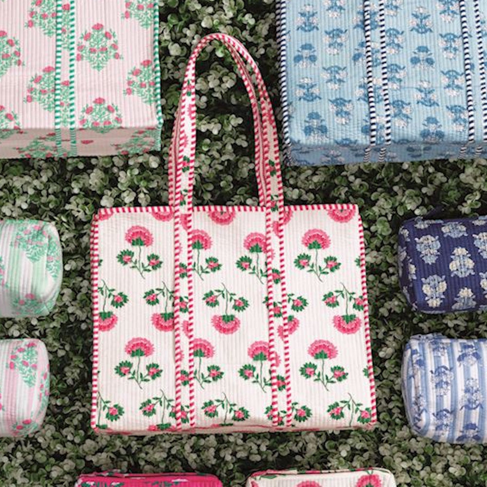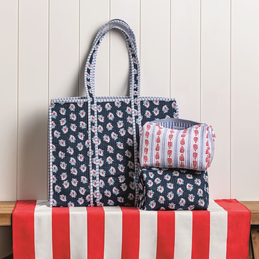 Quilted cotton block print tote with contrast stripe binding, liner and interior pocket.