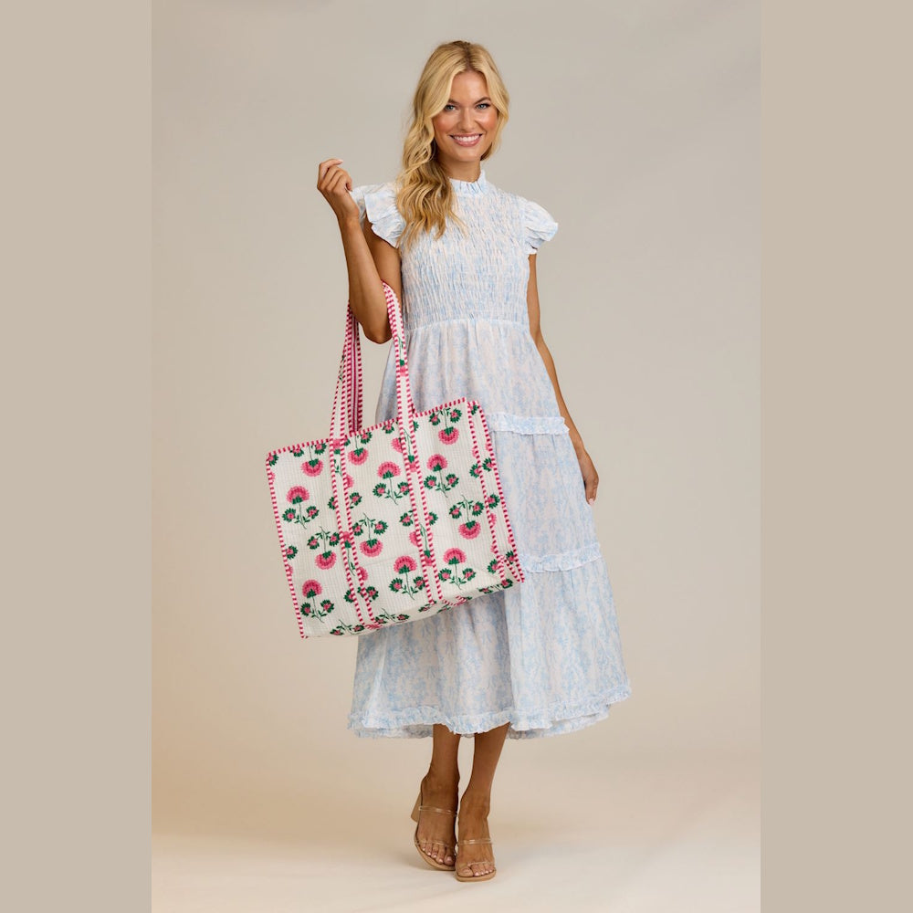 The timeless block print design adds texture and personality to your look, while the roomy interior gives you space for everything you need, wallet, planner, snacks, sunscreen, or even a lightweight sweater. Whether you’re heading to brunch, the farmer’s market, the beach, or school pickup, this tote keeps you organized in style.