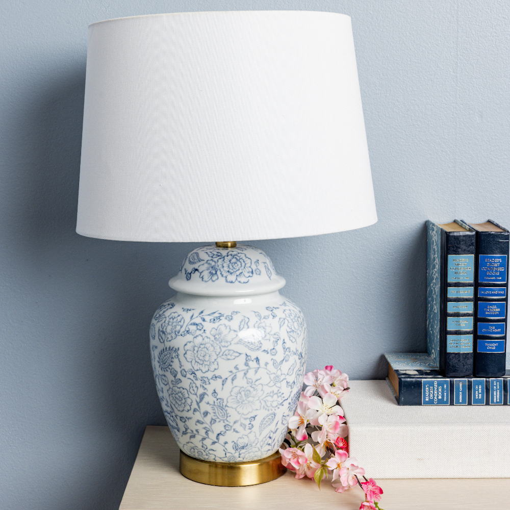 Add a touch of refined beauty to your space, buy the Blue Floral Ginger Jar Lamp with Shade today at MISS DAISY'S Home & Decor and let your home shine with style!
