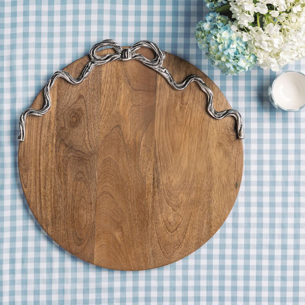Mango wood round board with dimensional metal bow.