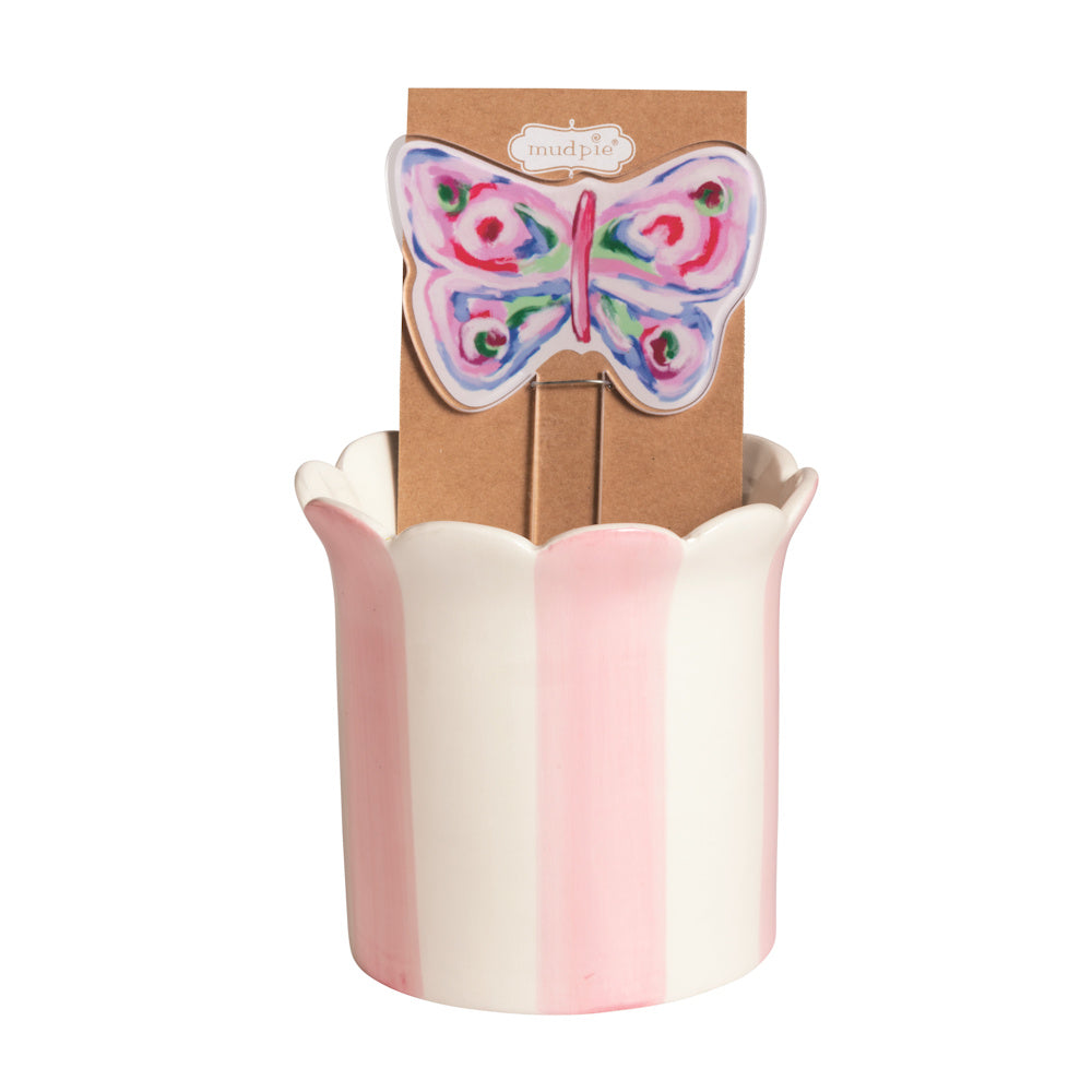 Bring a touch of nature-inspired charm to your space with the Butterfly Pot with Plant Stake from Mud Pie. Designed to delight, this decorative pot features a whimsical butterfly accent that instantly brightens windowsills, shelves, and tabletops, perfect for adding personality to your plants.