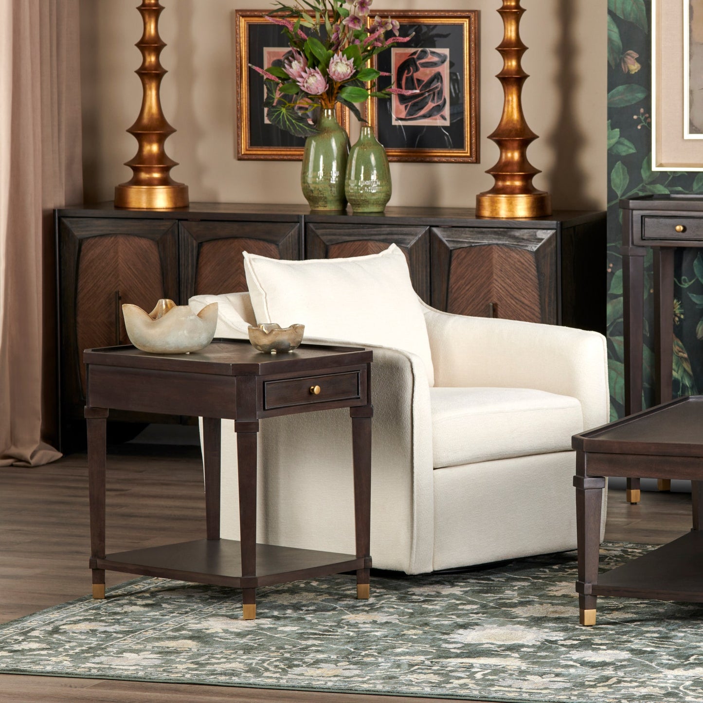 Classic and composed, the Carrington End Table features a rich wood finish paired with warm brass accents for a refined look. The single drawer keeps essentials tucked away, while the open lower shelf provides space for styling or storage.