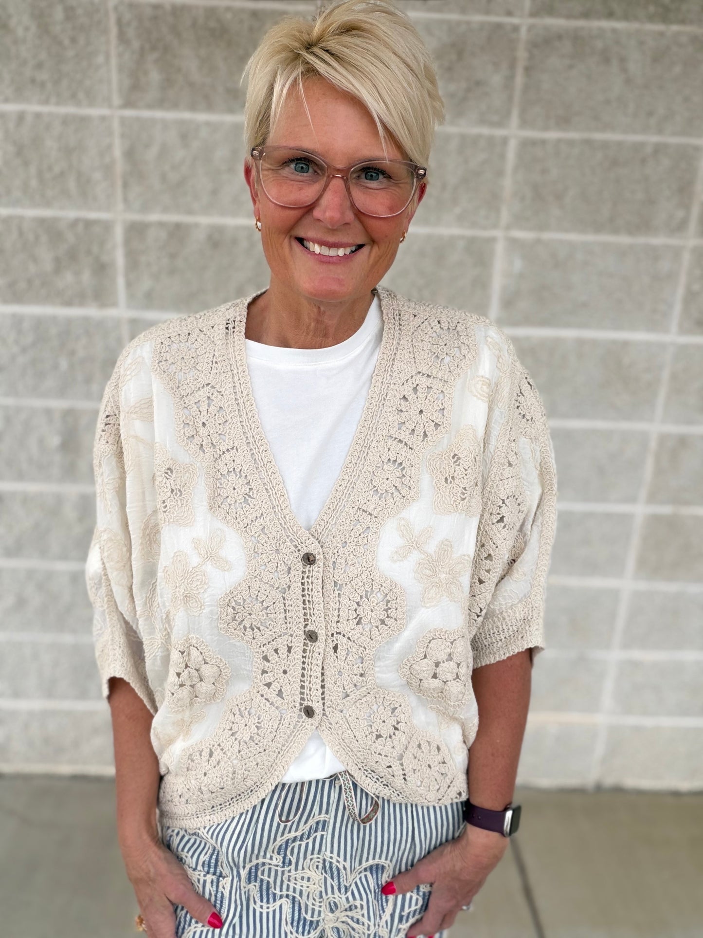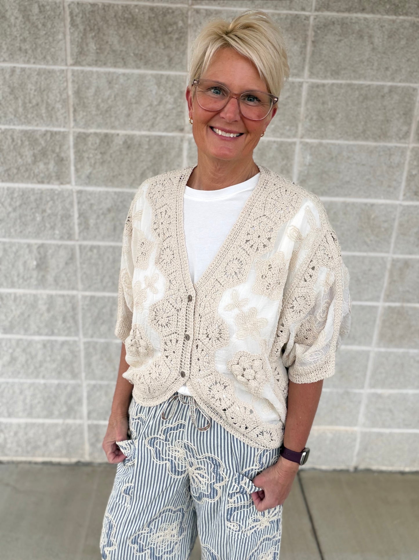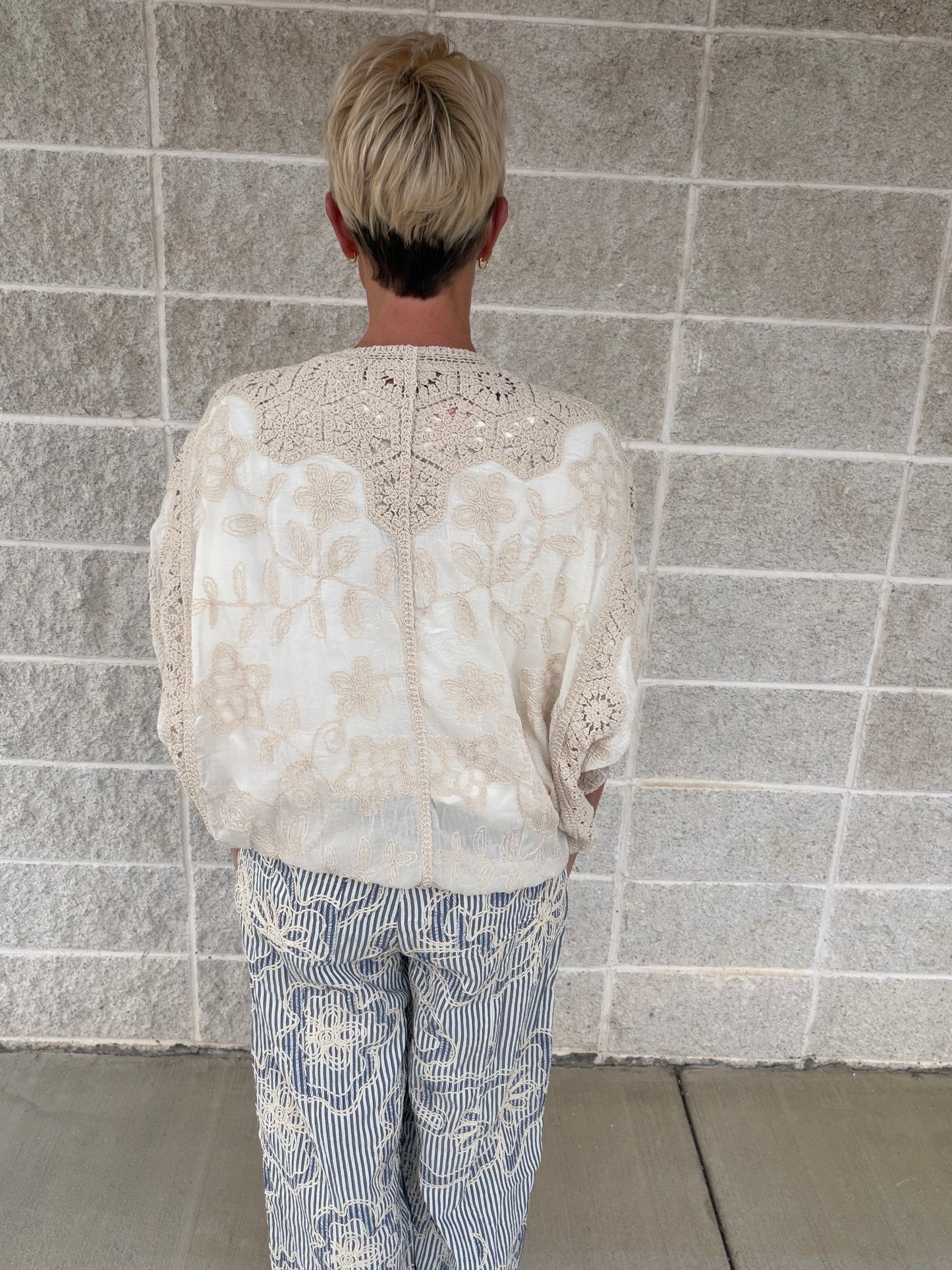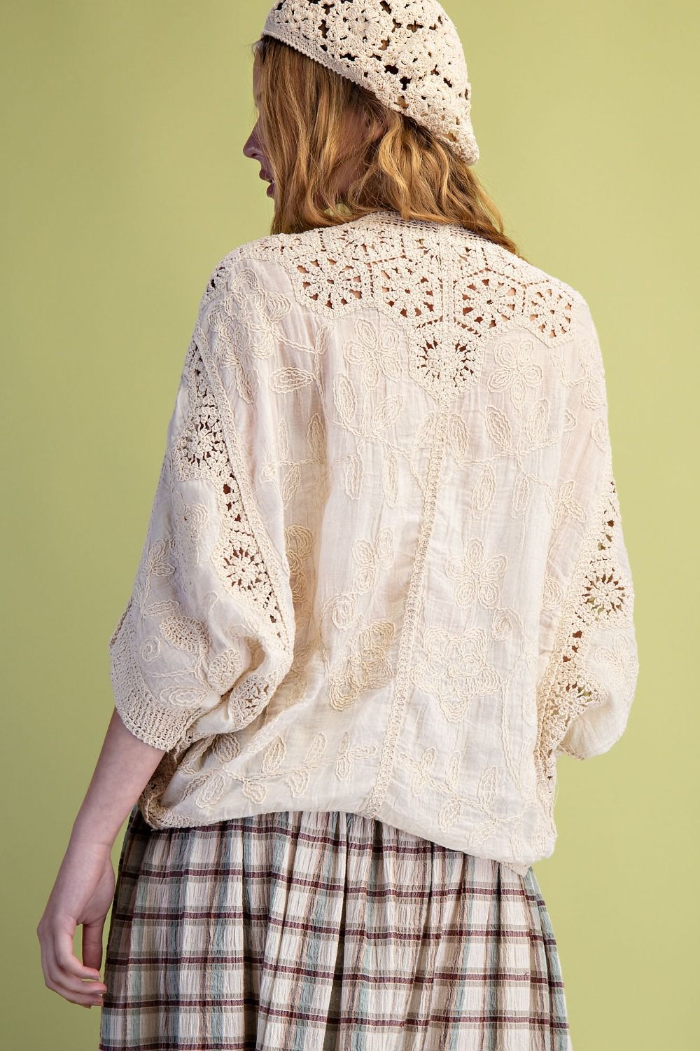Effortless elegance meets comfort in this versatile duster. Crafted from a breathable polyester-spandex blend, it features delicate floral embroidery and charming crochet trim that elevate any casual outfit. The relaxed, drapey silhouette with dolman sleeves drapes beautifully over your frame, while the front button closure offers easy styling flexibility. Perfect for layering or wearing solo, this piece brings a touch of bohemian sophistication to your everyday wardrobe.