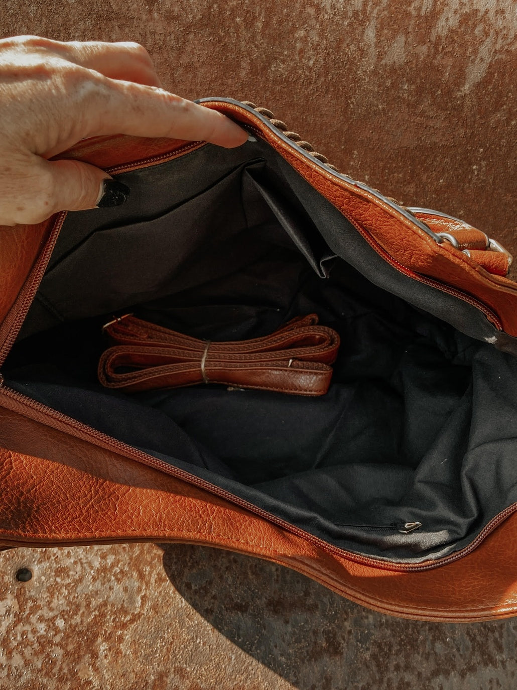 It's complete with an inside zipper pocket, 2 side pockets, zipper pocket on the backside and an adjustable detachable strap. This bag measures 11 inches by 18 inches by 5 1/2 inches, zipper closure ensuring every item inside is kept safe and secure.