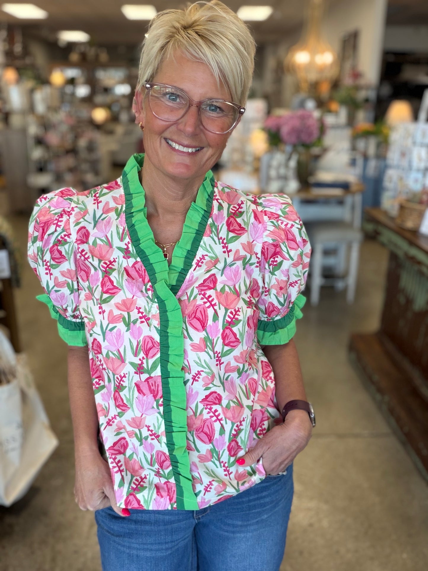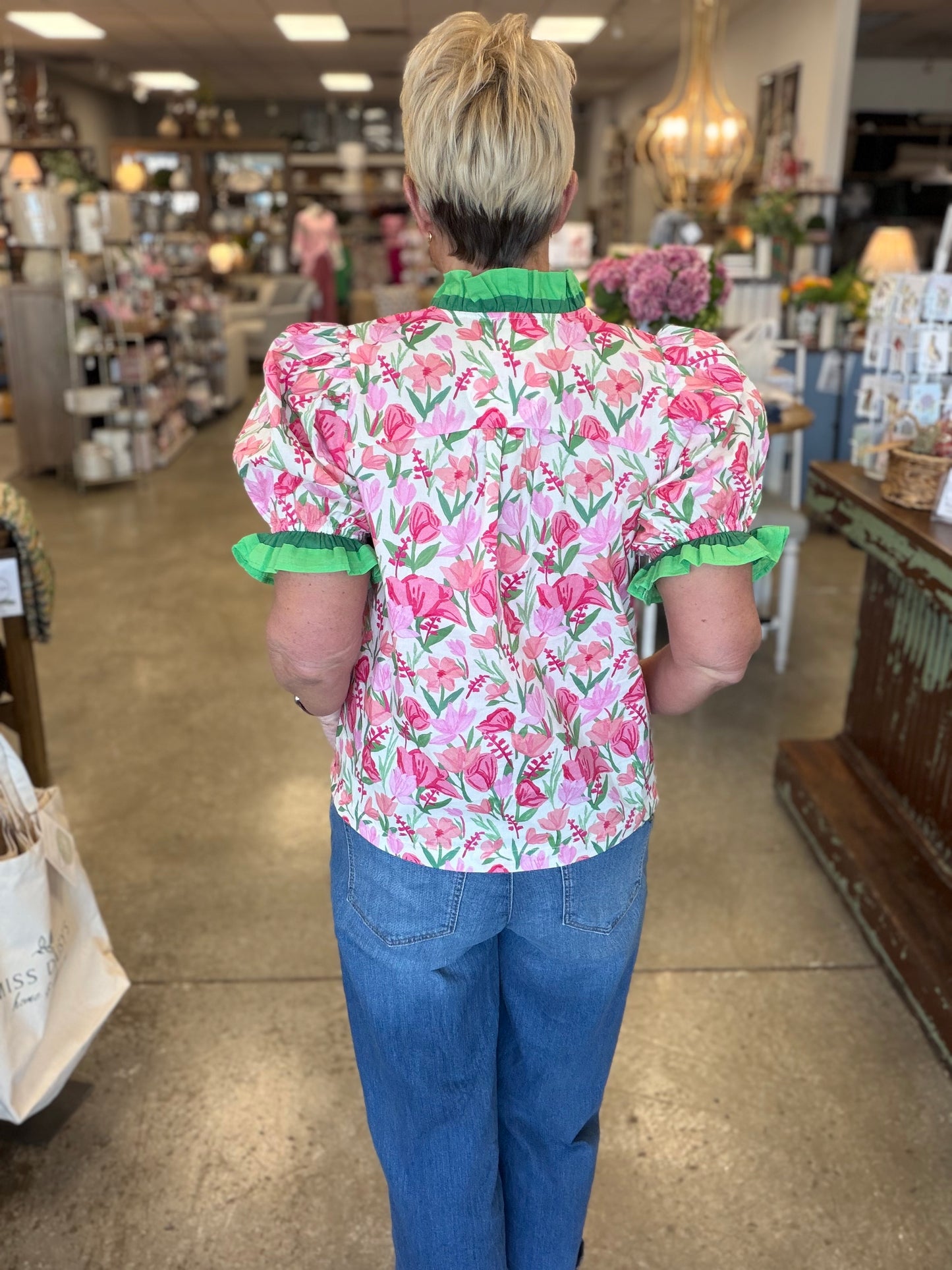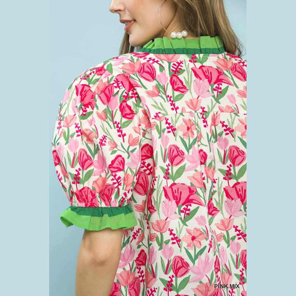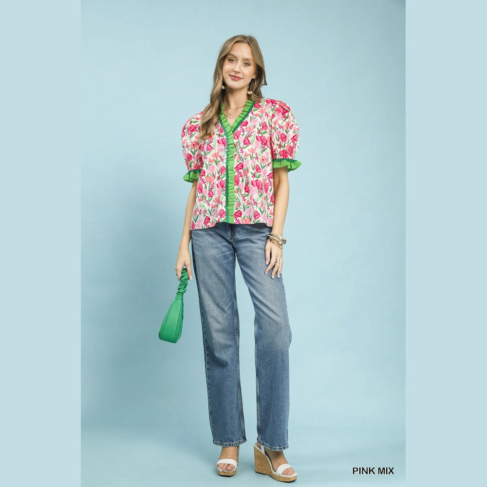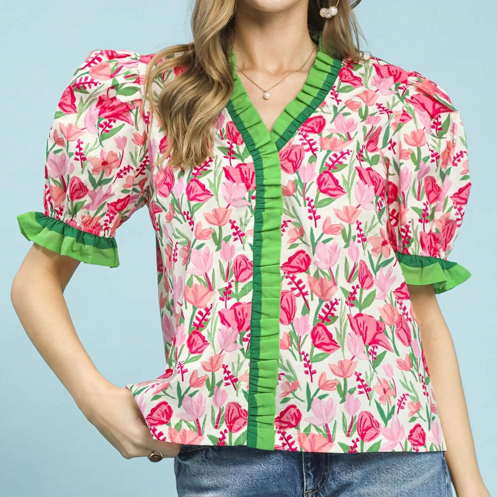 Elevate your casual or dressy ensembles with effortless flair. Shop the Floral Ruffle Trim Puff Sleeve Blouse today at MISS DAISY'S Home & Decor and showcase your chic, feminine style with Umgee USA.