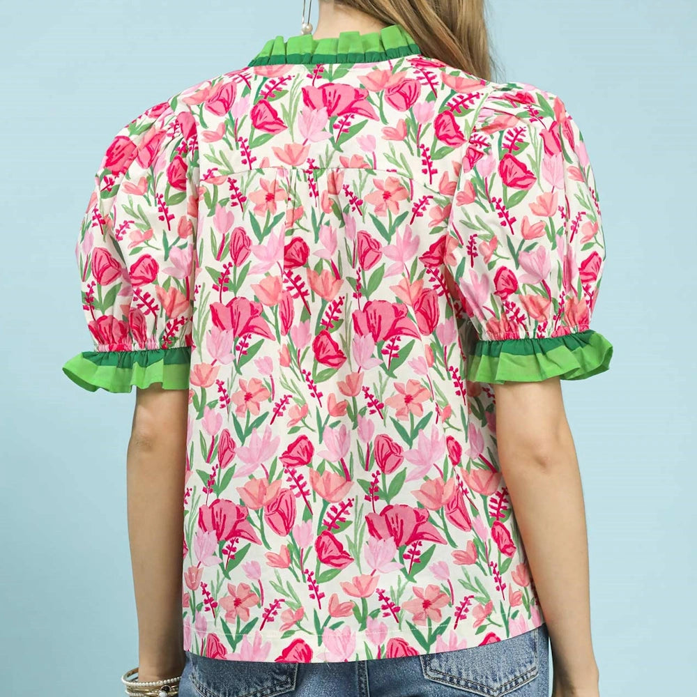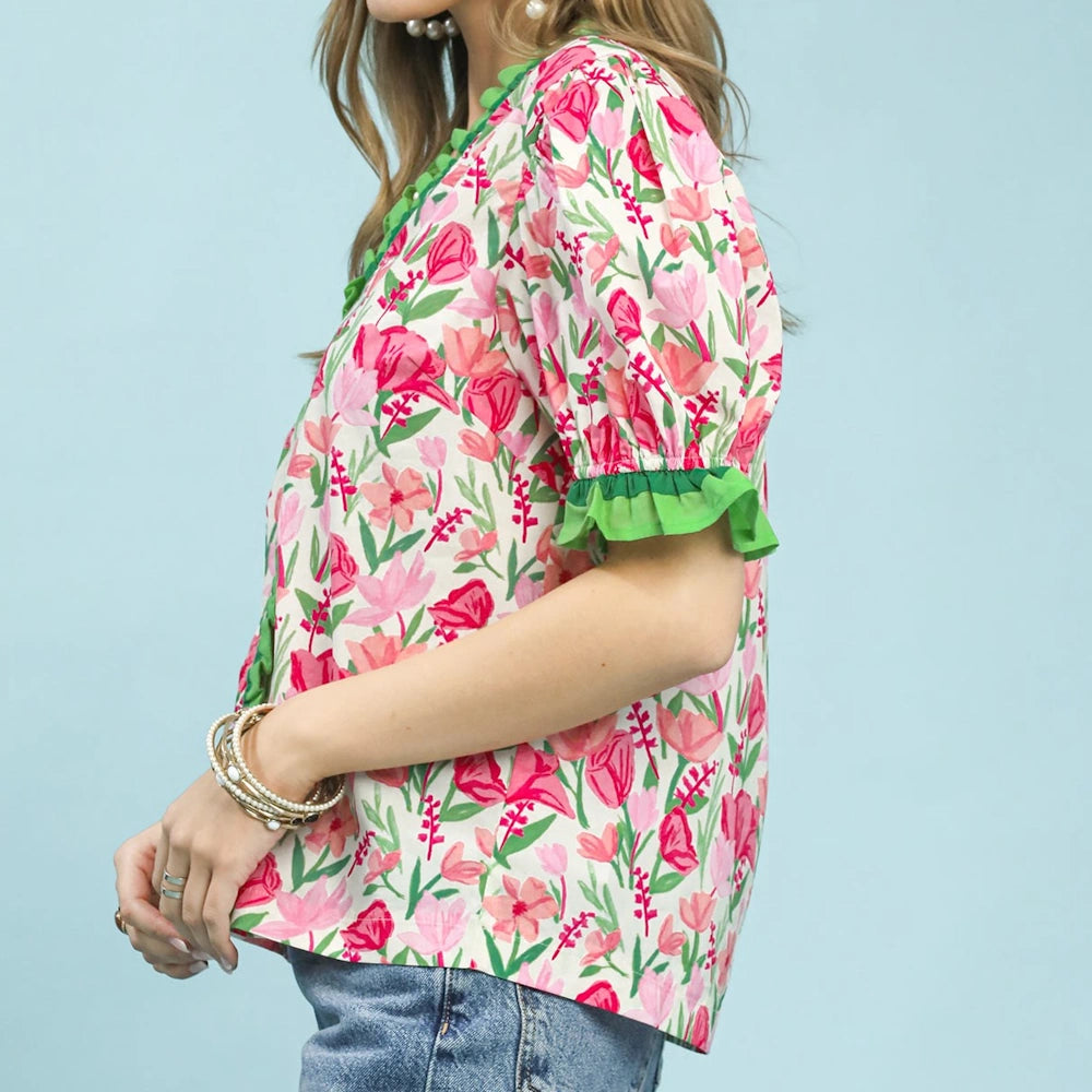 Floral Ruffle Trim Puff Sleeve Blouse