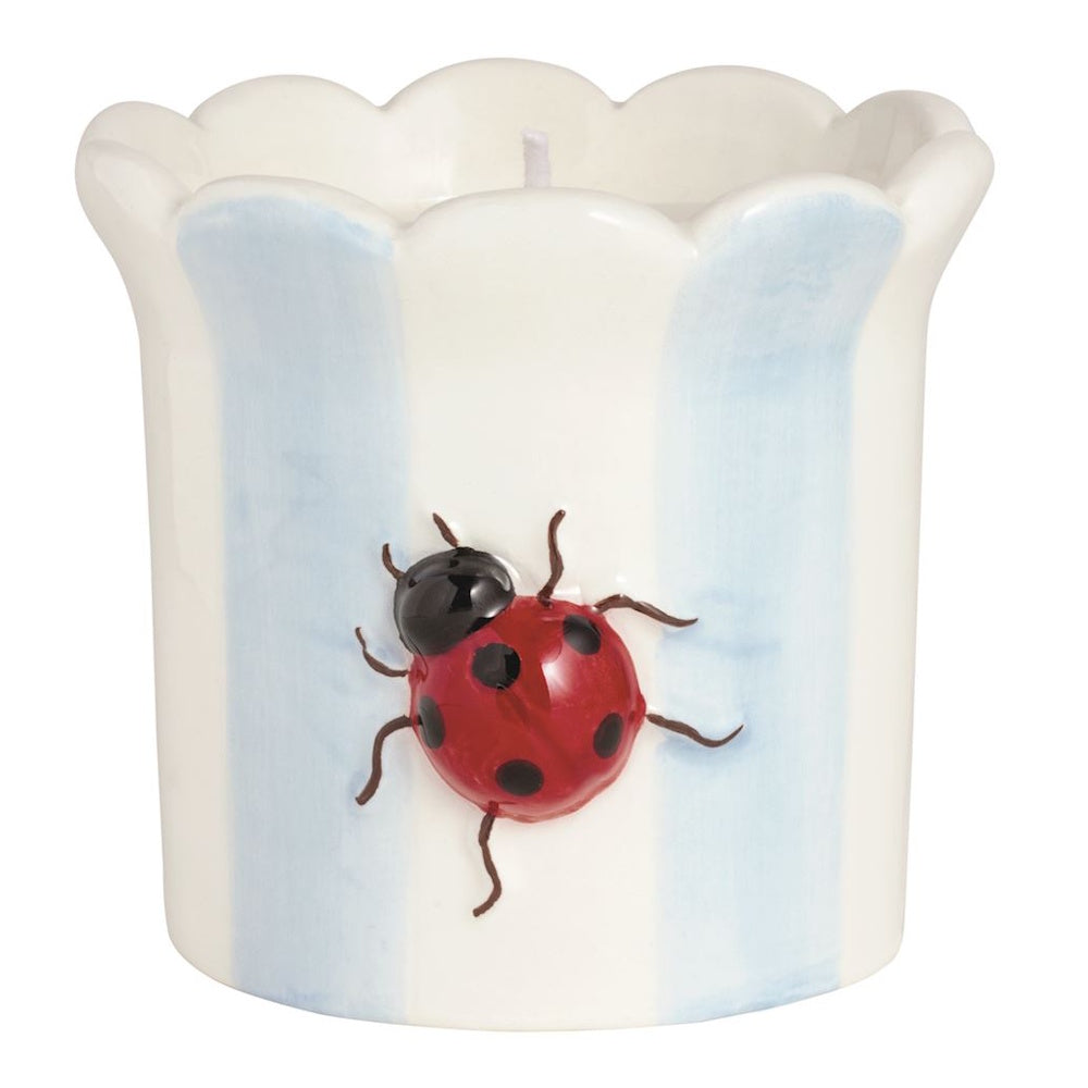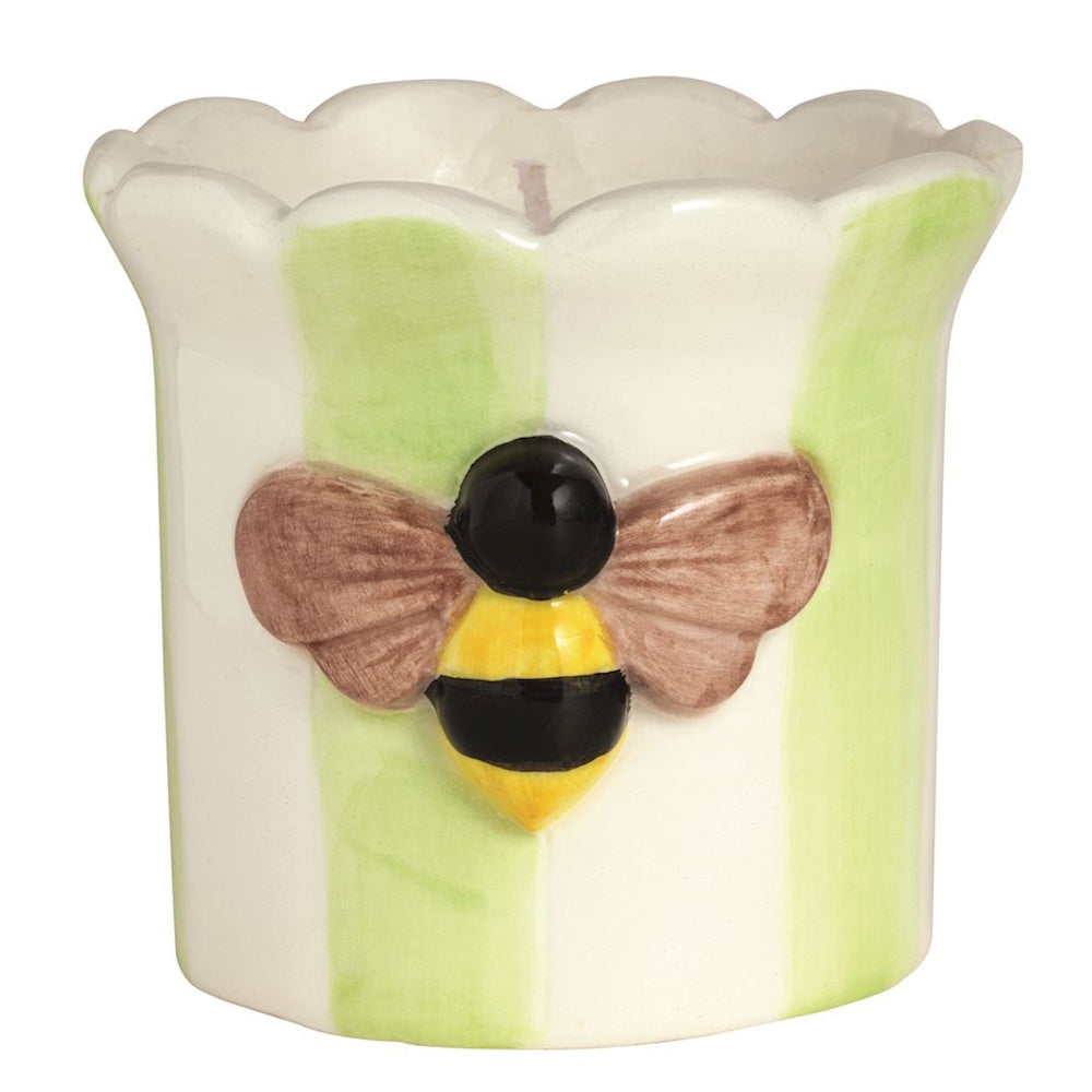 Hand-painted ceramic candle features dimensional icon, scallop rim and vanilla scented wax.