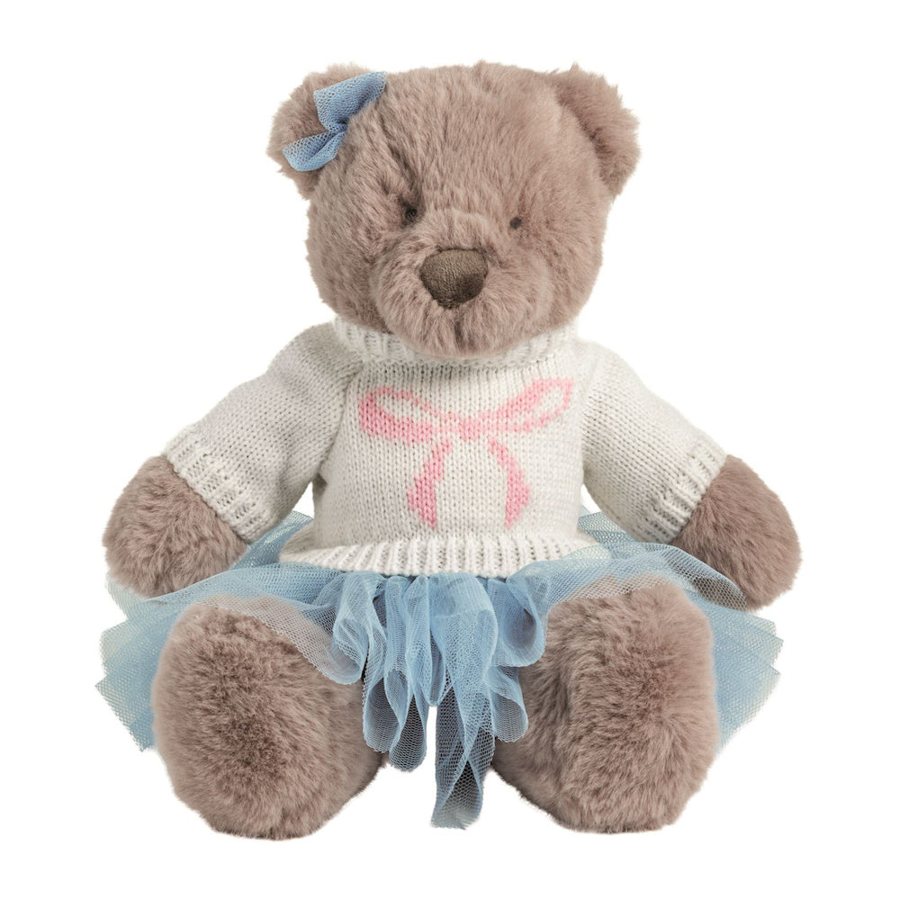 Faux fur plush bear wearing yarn knit sweater, mesh tutu and bow has weighted hands, feet and seat.