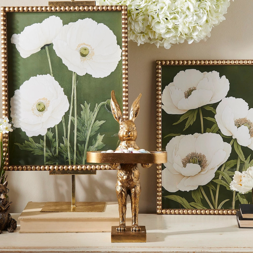 Crafted with a radiant gold finish, this elegant rabbit holds a functional tray perfect for showcasing wrapped candies, decorative eggs, tea lights, or small floral accents. It’s not just décor, it’s a beautiful way to serve, style, and celebrate the season.