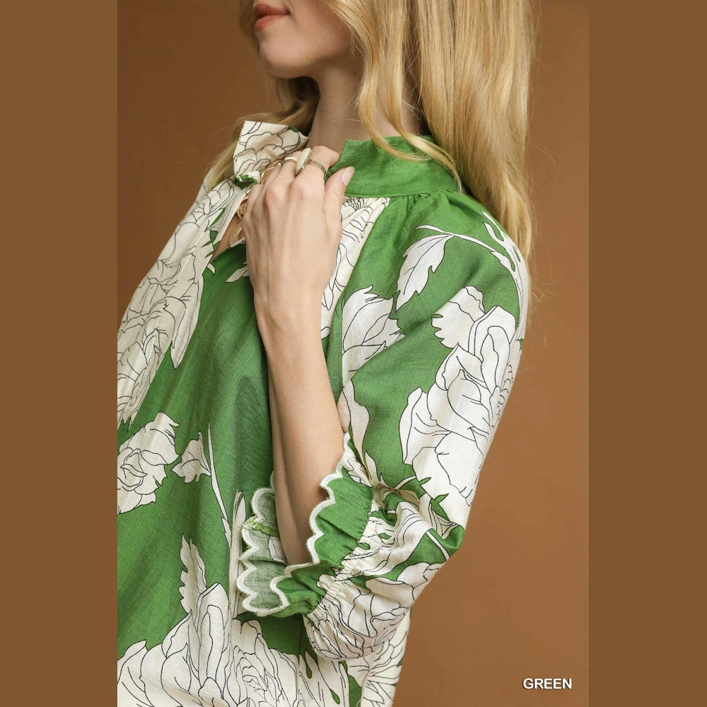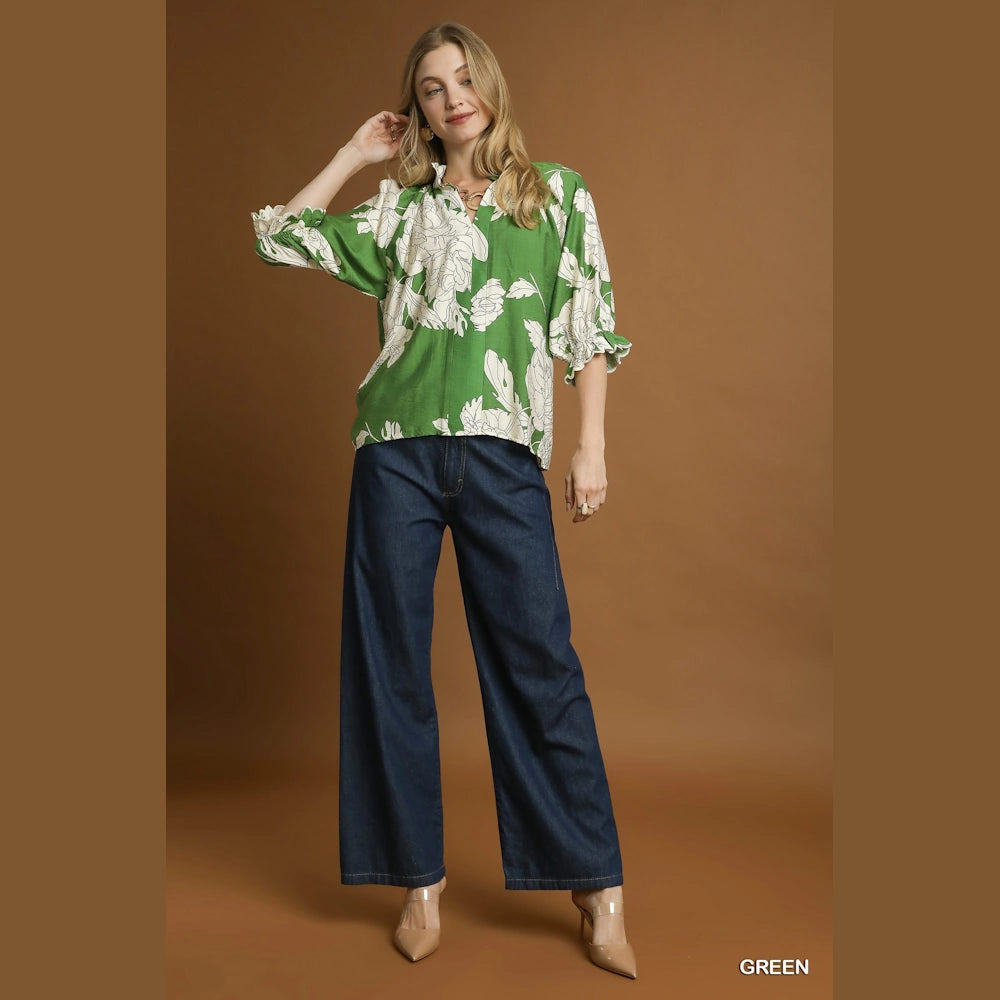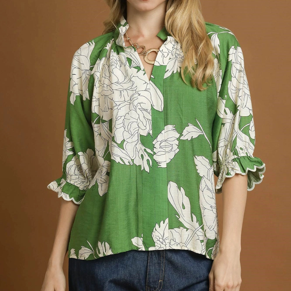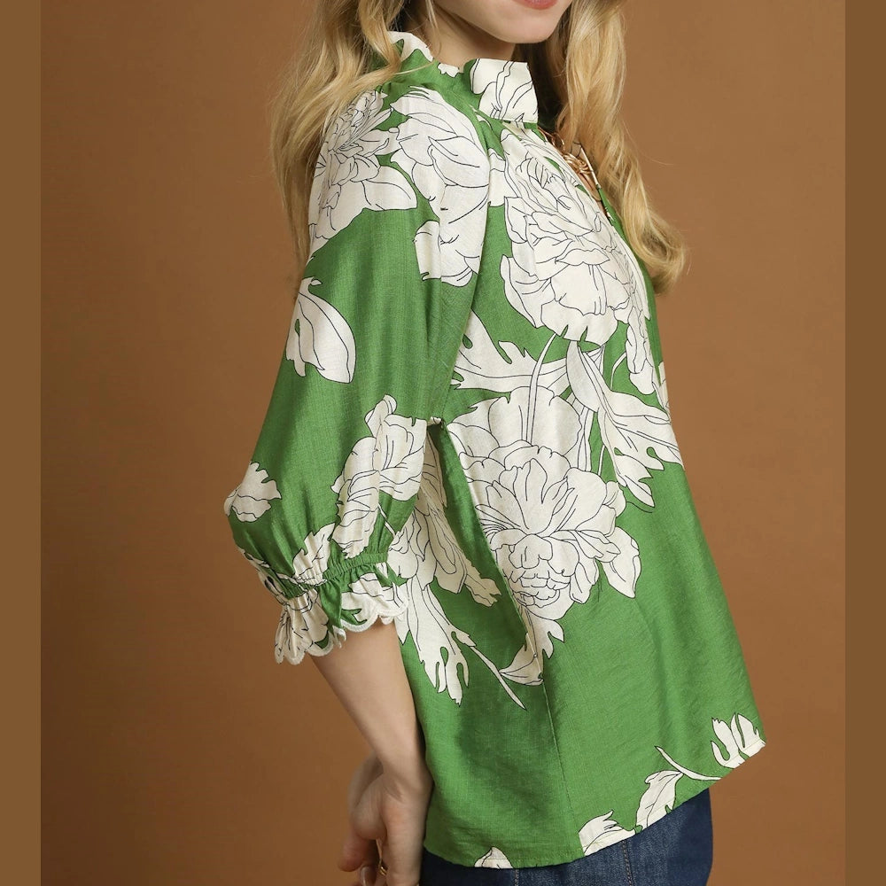 Shop the Green Peony Print High Neck Top now at MISS DAISY’S Home & Decor and enjoy signature Umgee USA style with a feminine twist.