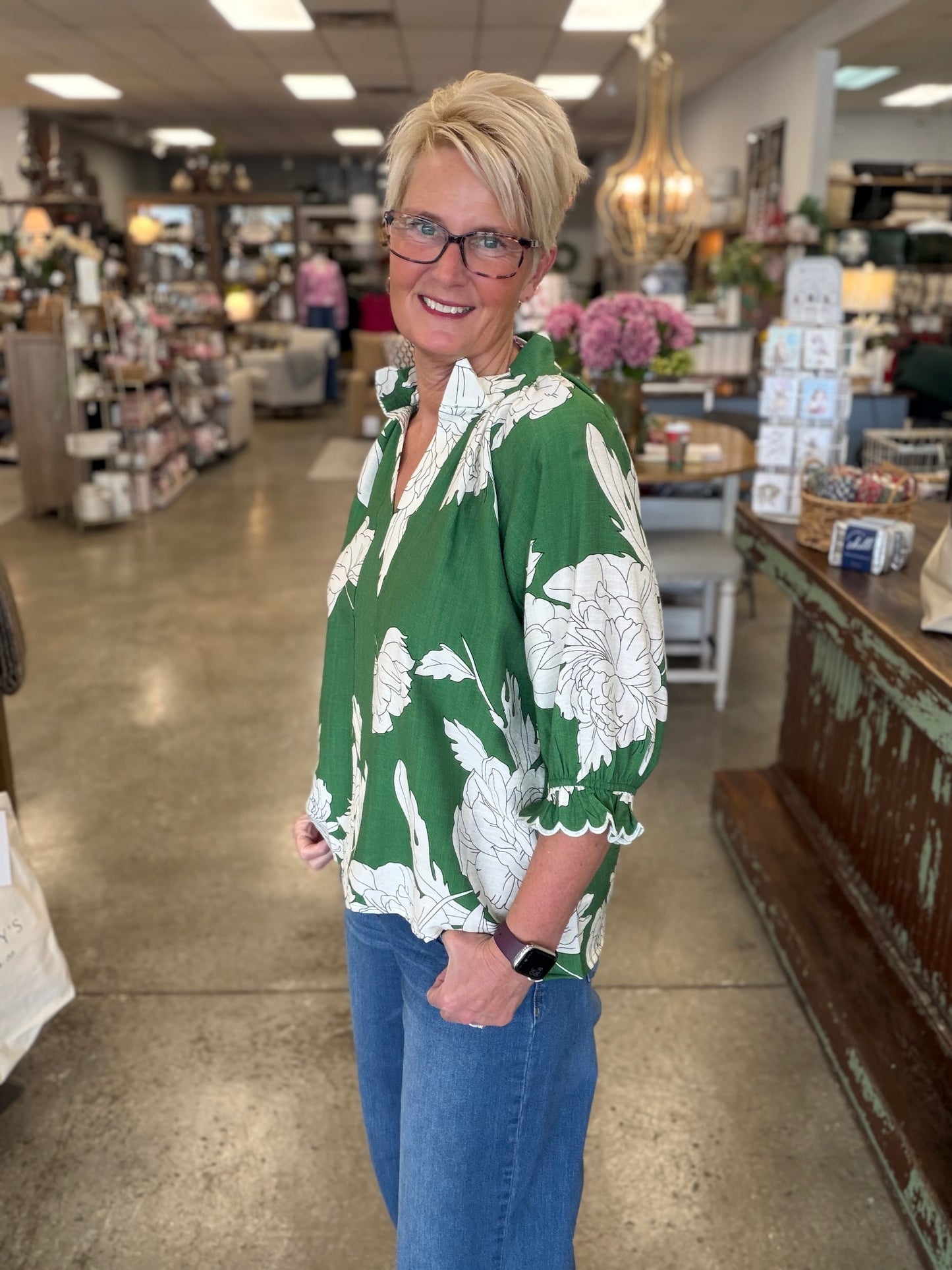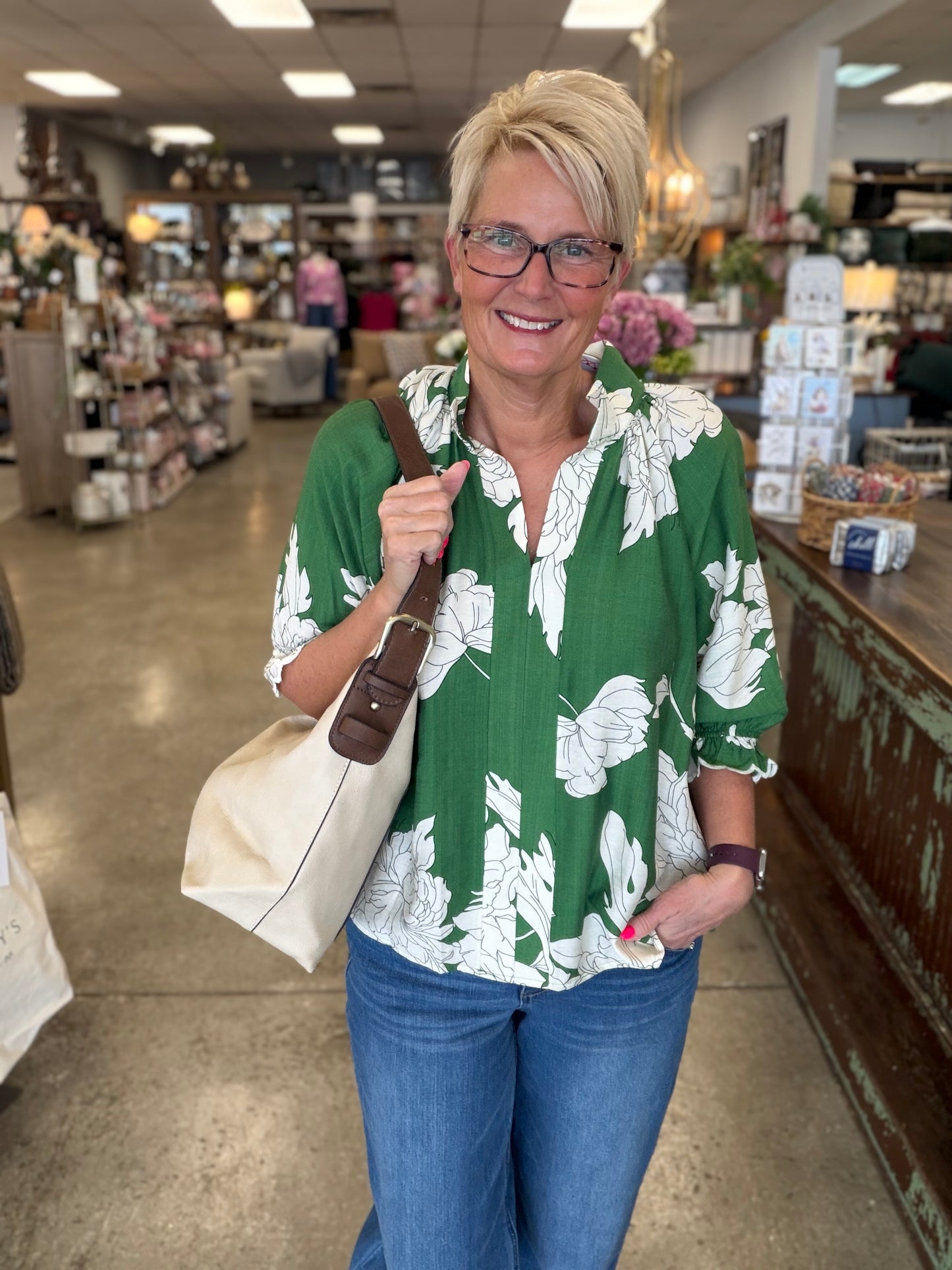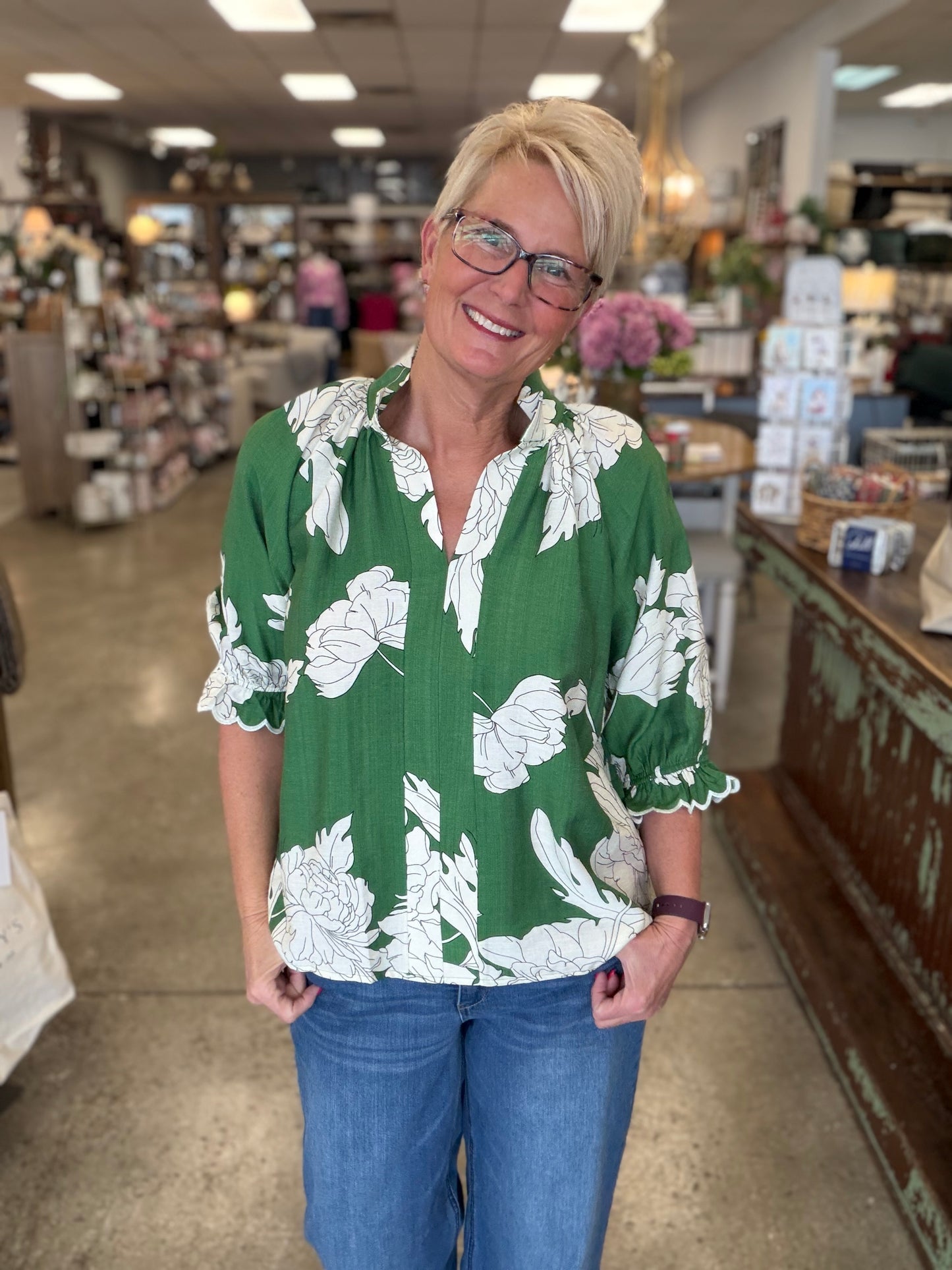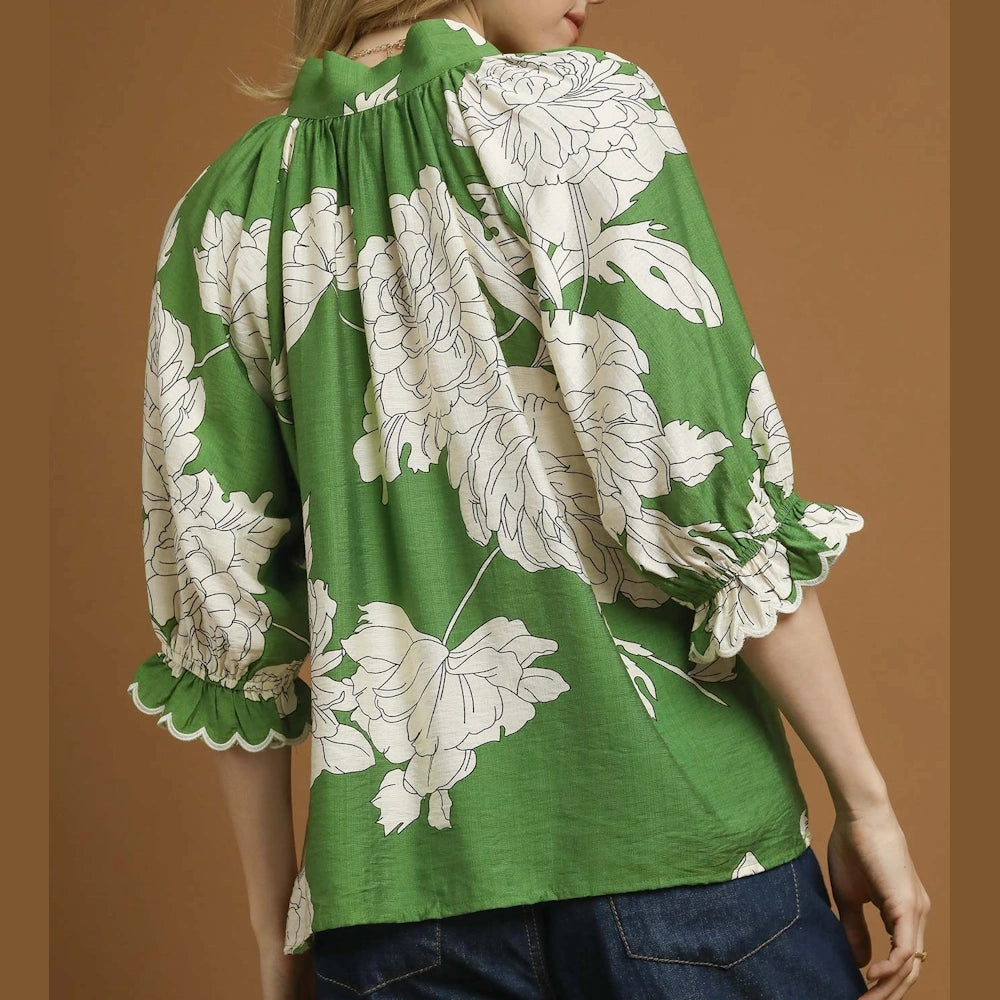 Shop the Green Peony Print High Neck Top now at MISS DAISY’S Home & Decor and enjoy signature Umgee USA style with a feminine twist.