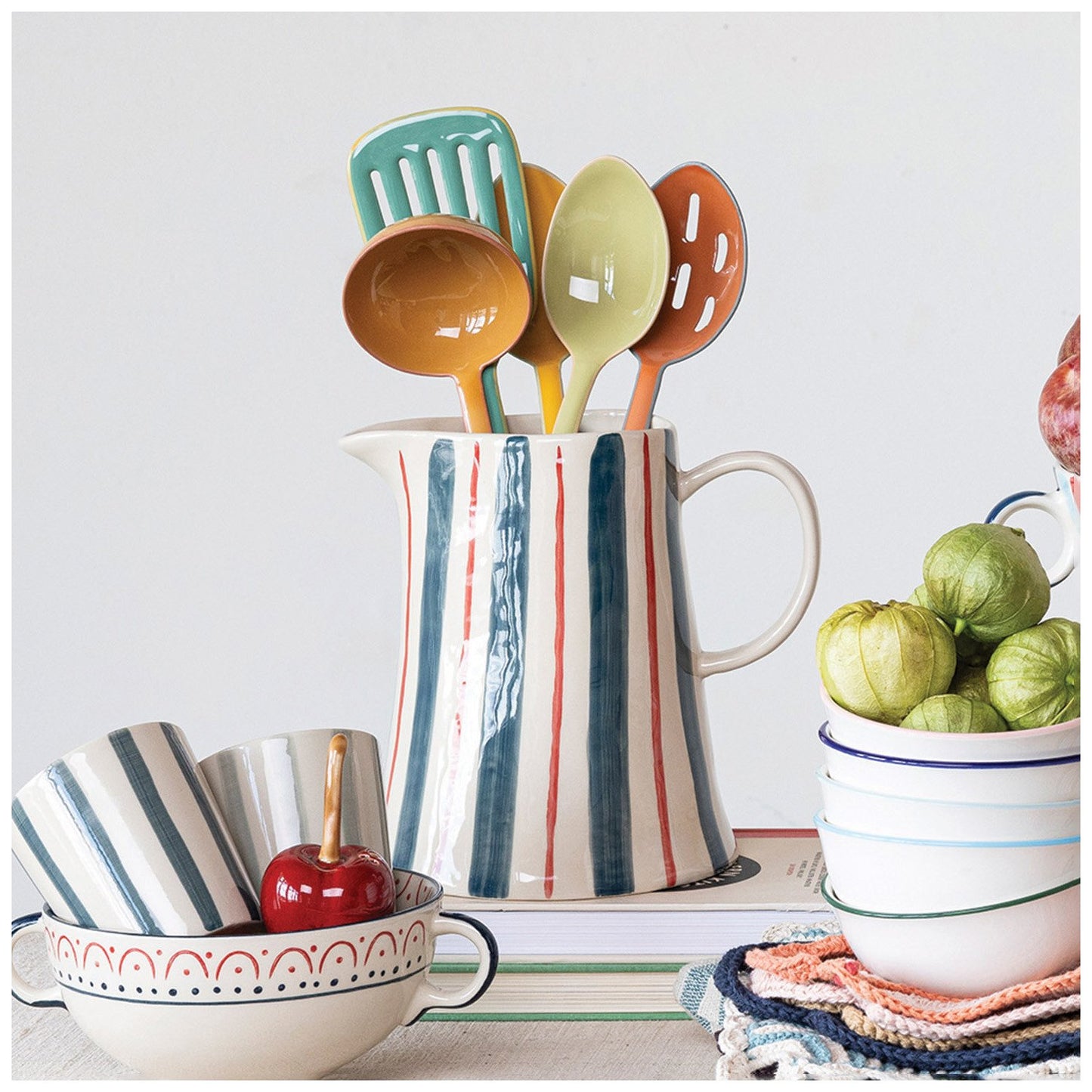 Hand-Painted Pitcher With Stripes (Red, White, Navy)