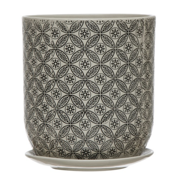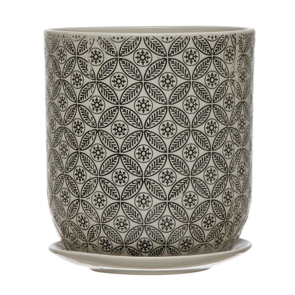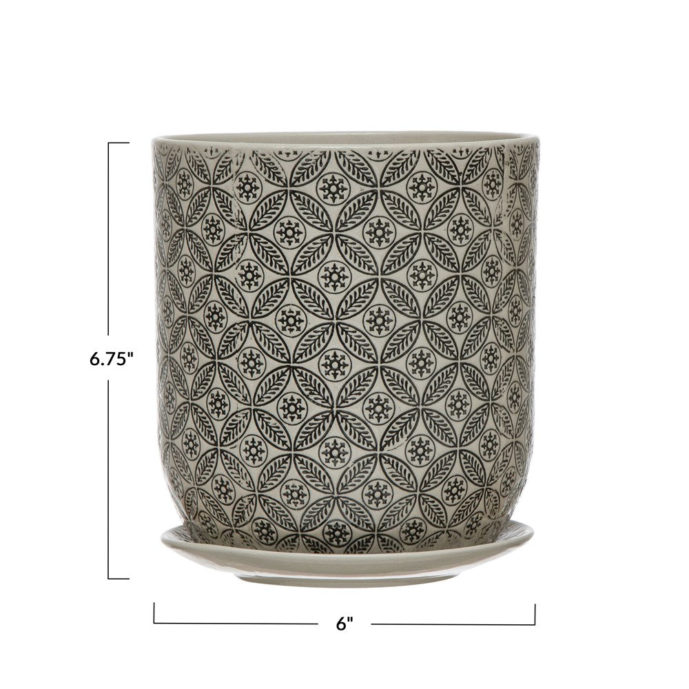 Hand-Stamped Stoneware Pot & Saucer w/ Embossed Pattern, Black & Cream Color 6" Round x 6-3/4"H Hand-Stamped Stoneware Pot & Saucer w/ Embossed Pattern, Black & Cream Color, Set of 2 (Holds 5" Pot)