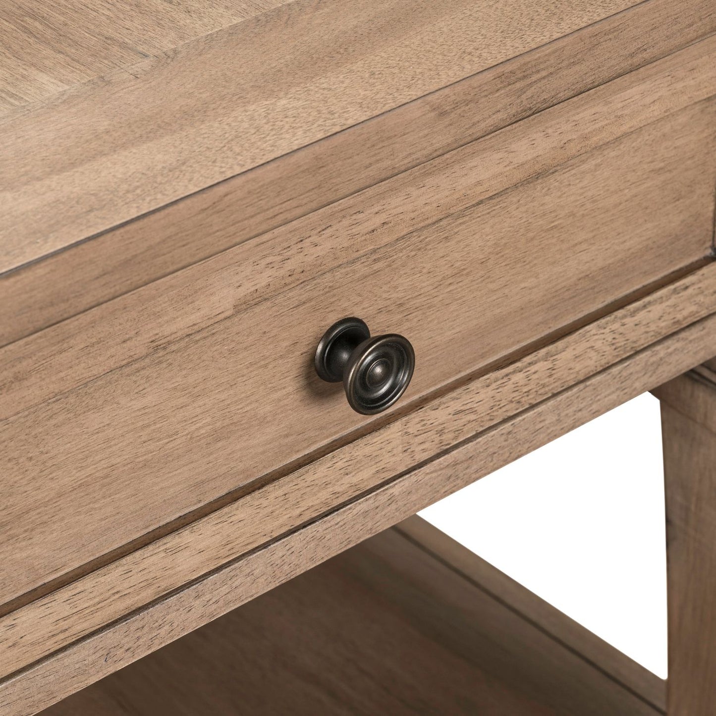 The Haven Hills End Table brings timeless style and practical charm to your living space. Crafted of Rubberwood solids with Rustic Birch veneers in a warm Camel Beige finish, this table pairs classic design with everyday functionality. A wood-framed storage drawer offers a convenient spot to tuck away essentials, accented with elegant Burnished Brass knob hardware. Under top molding adds a refined touch, while square turned legs provide a traditional feel. An open bottom shelf offers space for décor or additional storage, making the Haven Hills End Table a perfect companion piece with both beauty and purpose.