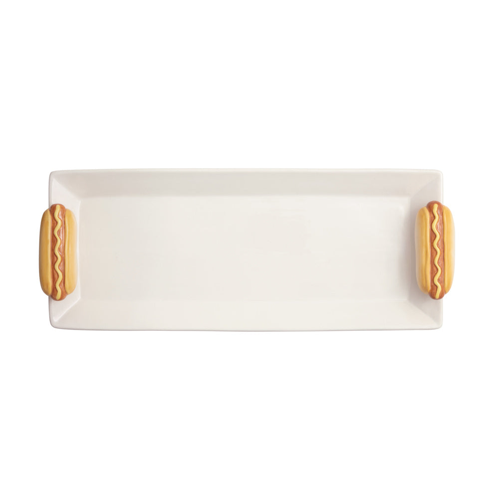 Ceramic tray features hand-painted hot dog handle attachments.