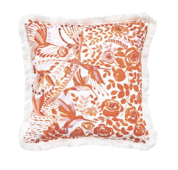 Hummingbird Floral Pillow With vibrant hummingbird artwork by Starla Michelle Halfmann and a textured fringed edge, this digitally printed pillow is truly one-of-a-kind.