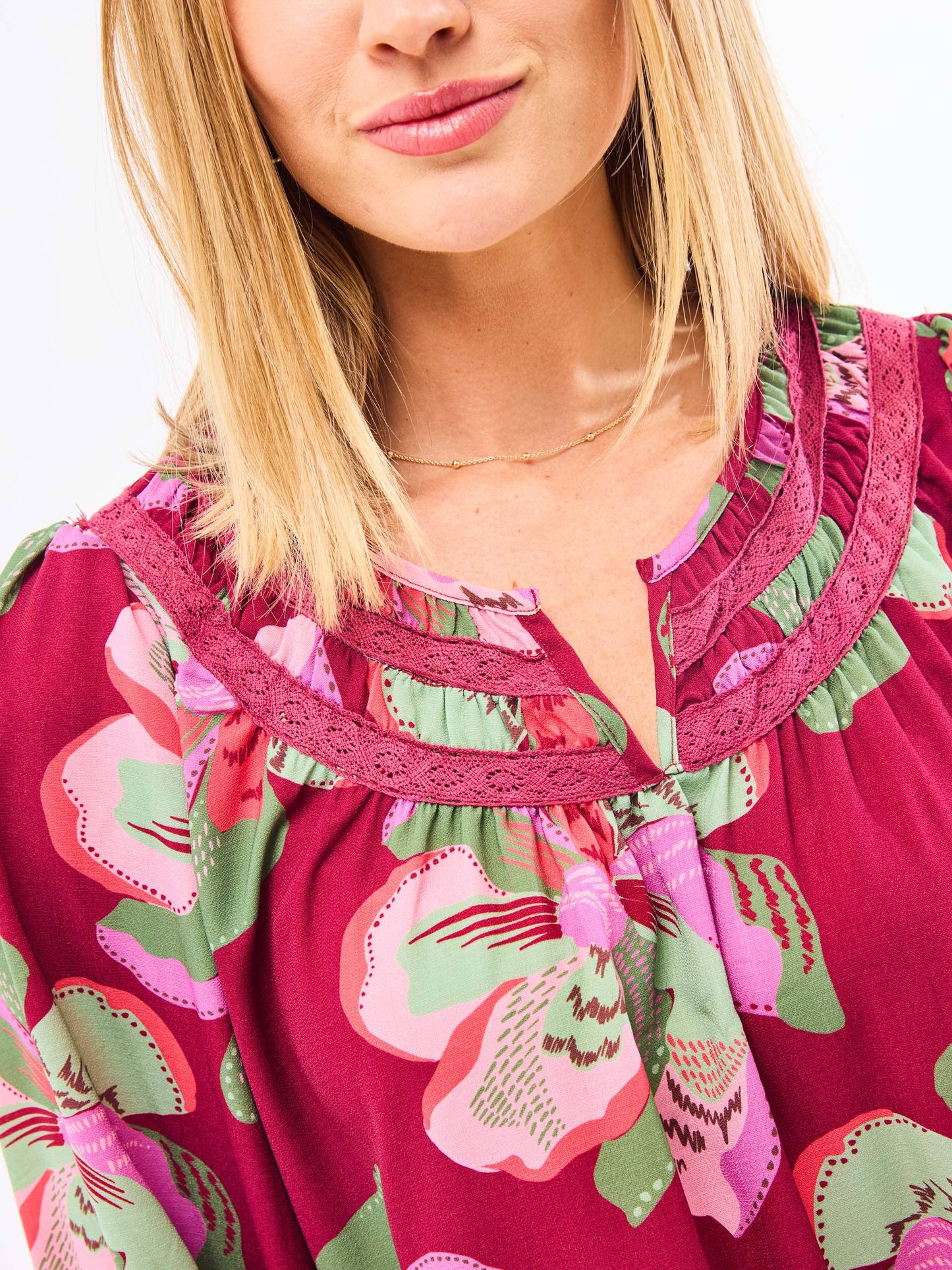The Janelle Top is a sophisticated blend of classic charm and contemporary design. The intricate crochet lace trim details elevate the look, while the notched neckline adds a flattering touch. Long sleeves with elastic cuffs provide a comfortable, feminine fit that’s perfect for any occasion.